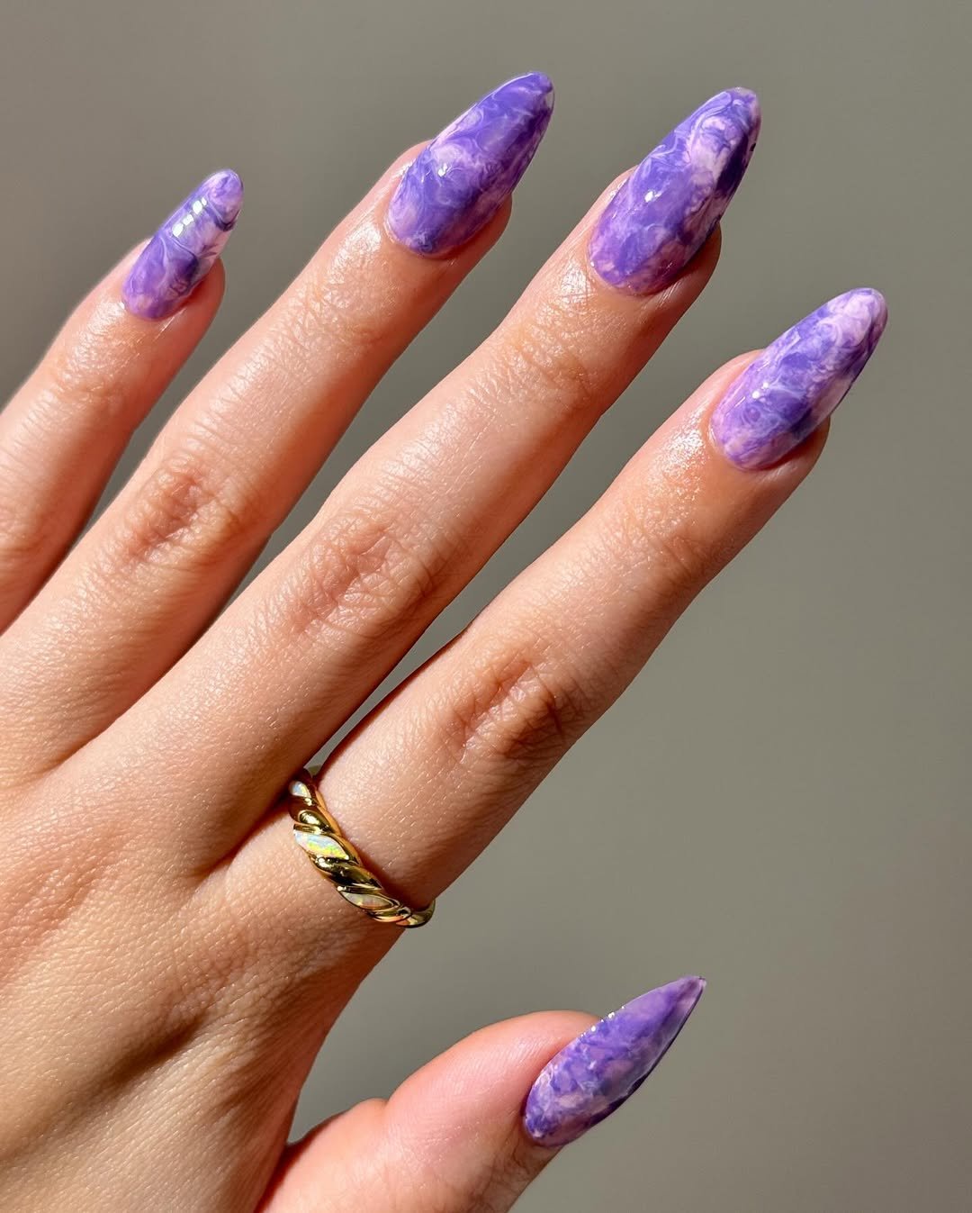 These nails offer an elevated yet everyday aesthetic. The base features a soft lavender hue with subtle marbling that catches the light, providing visual interest without being overwhelming. This design maintains a minimalist feel that is far from dull, serving as a versatile manicure that complements any outfit and garners appreciative glances upon closer inspection.