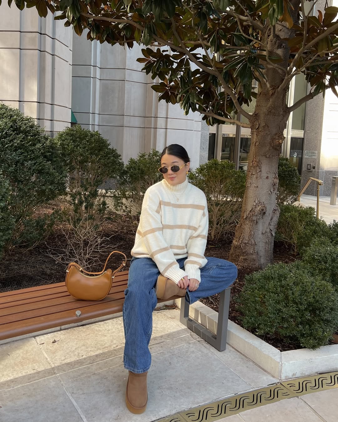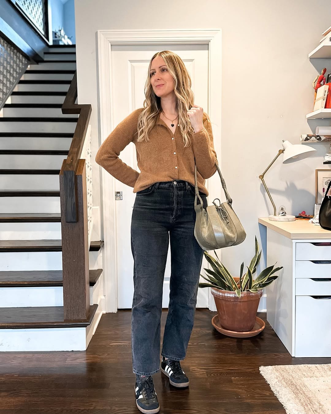 The slouchy tan tote bag adds warmth and depth. The combination of soft knitwear and structured denim creates a cozy yet confident energy, perfect for transitional weather dressing.