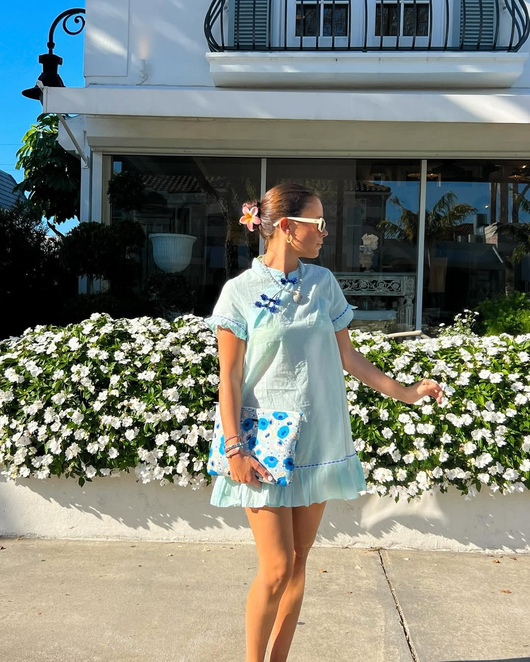 This mint mini dress exudes a breezy charm. Its loose silhouette, delicate trim, and matching clutch create a light yet considered look. Paired with white sunglasses and a flower in the hair, it evokes a European summer morning vibe.
