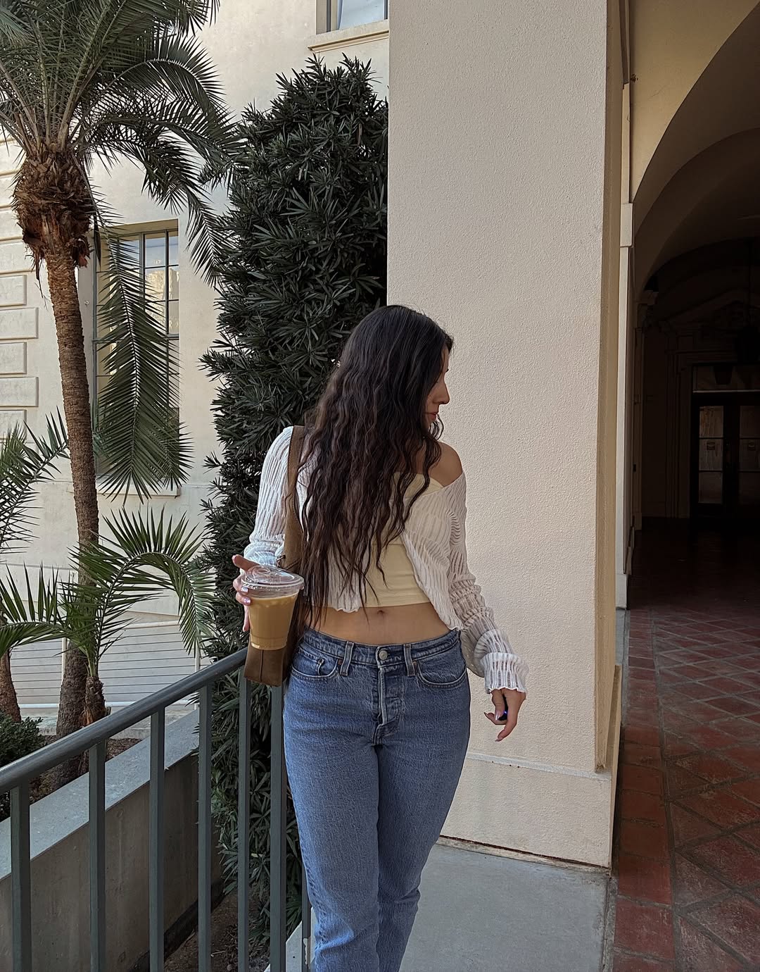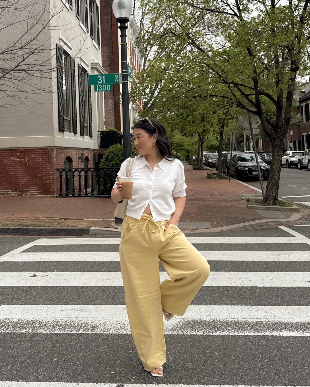 A neutral button-down shirt paired with relaxed yellow trousers, complete with an iced coffee, exemplifies simple yet effective spring style. The proportions are easy and airy, making it suitable for transitional weather.