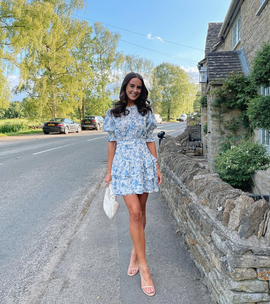 A blue floral mini dress set in a picturesque countryside backdrop is exceptionally charming. The puff sleeves and tiered skirt add romantic details, while sleek heels prevent the look from becoming too sweet, offering a modern twist on a classic theme.