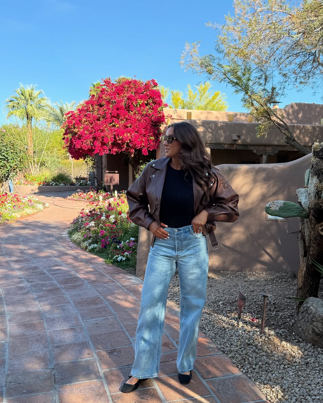 A brown leather jacket against a desert backdrop creates a powerful aesthetic. A black tee provides a grounded base, light-wash denim adds an element of ease, and simple flats contribute to an unfussy overall look. When set against blooming bougainvillea and adobe walls, the outfit appears polished yet understated.