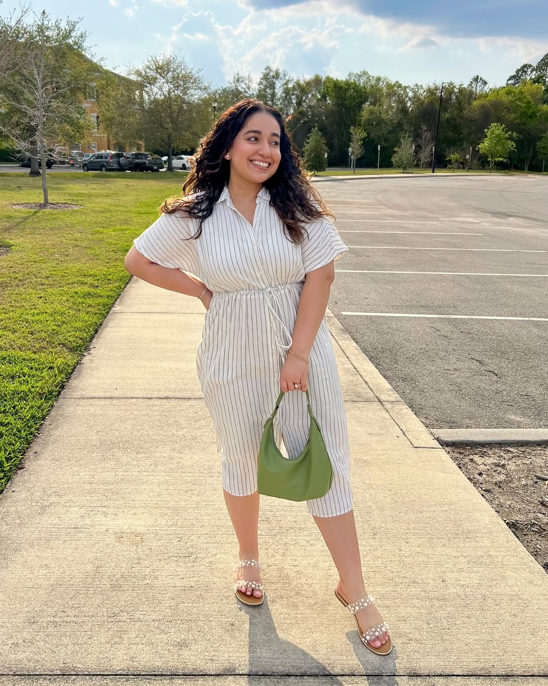 A simple striped shirt dress, when styled effectively, offers a refreshing appeal. The cinched waist provides definition, the midi length ensures practicality, and the pop of green from the bag adds a subtle, smart touch.