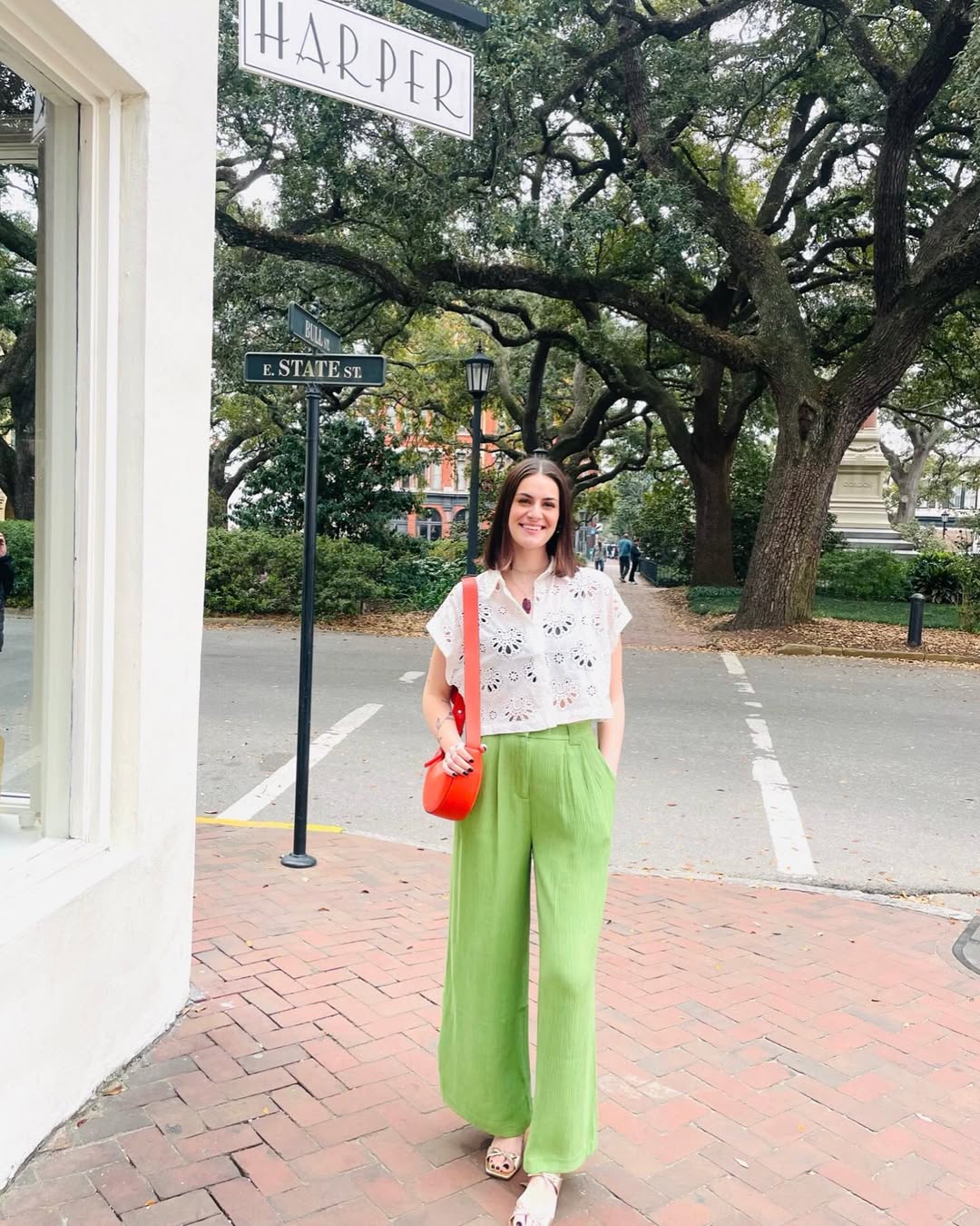 This outfit is a visual celebration. The vibrant green wide-leg trousers paired with a crisp eyelet top and a striking red bag are an unexpected yet delightful combination, feeling playful and entirely wearable.