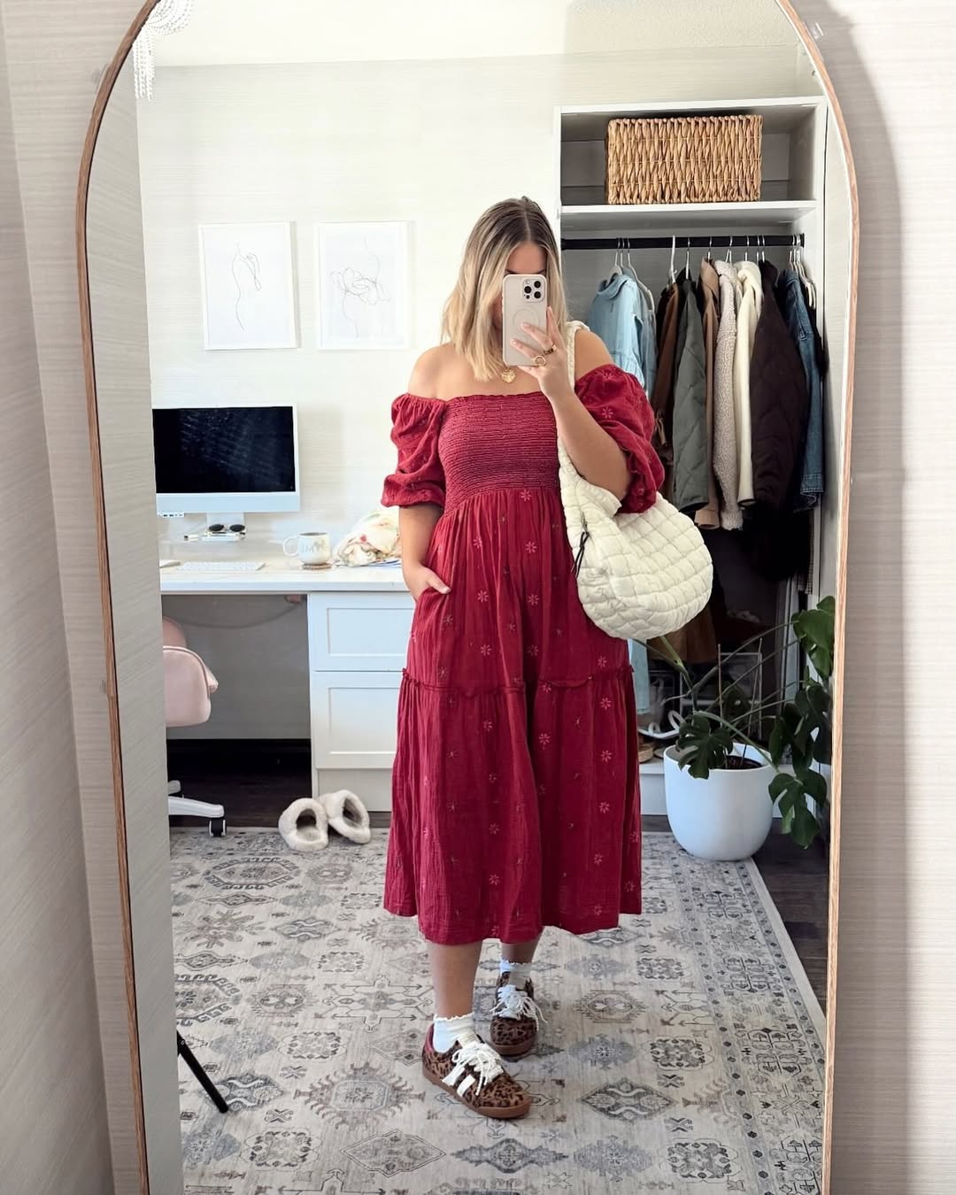 The styling, particularly the pairing with sneakers, keeps the look grounded and approachable. It conveys an effortful style without sacrificing comfort, allowing the dress to be the focal point while ensuring the wearer feels radiant.
