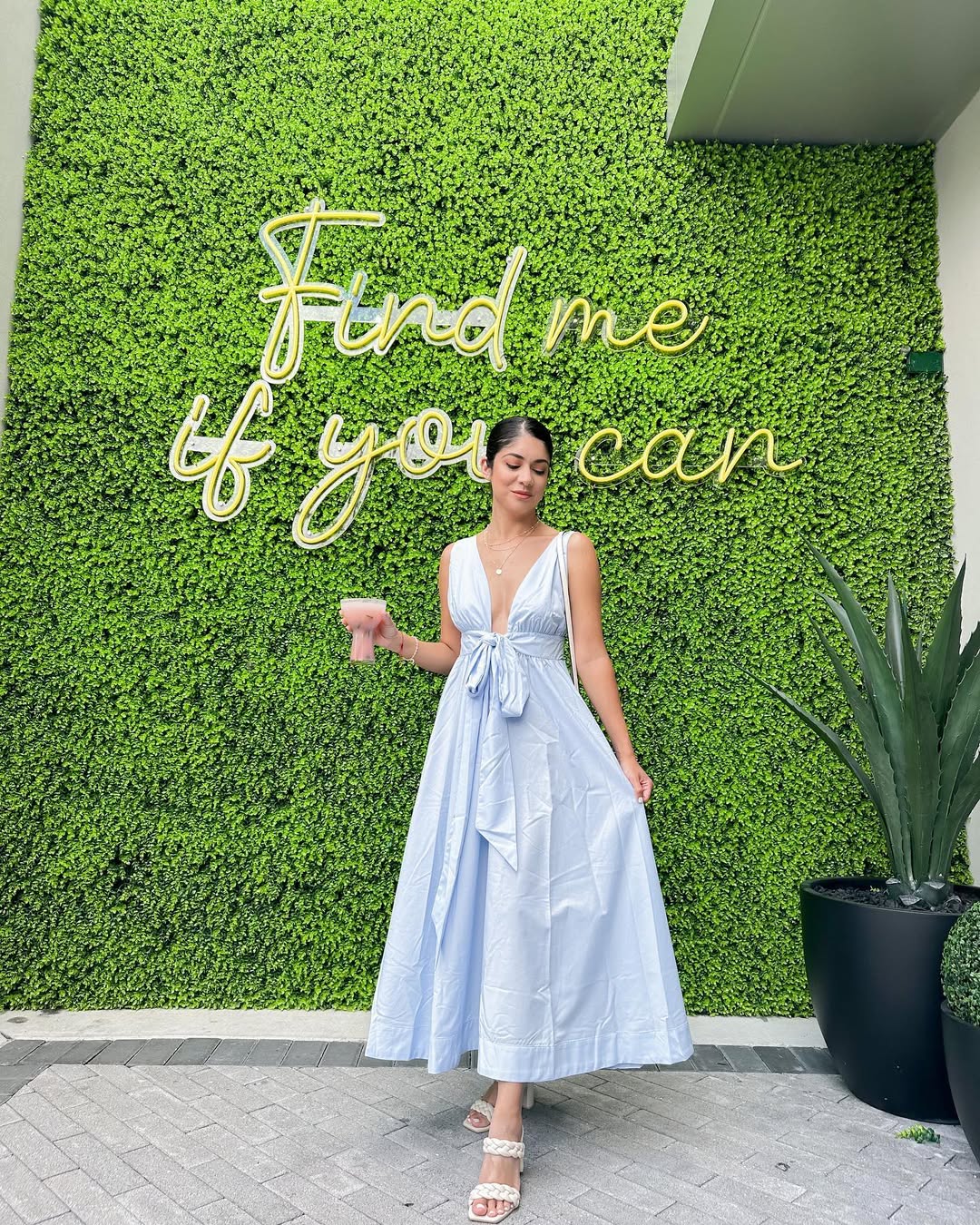 This ensemble evokes a soft, main-character vibe. The powder blue dress set against a vibrant green backdrop creates a polished, feminine, and subtly flirtatious impression. The bow detail and flowing skirt add movement, while braided heels keep the look playful rather than overly formal.