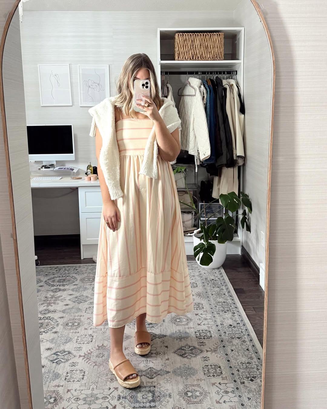 A cream-and-blush striped midi dress paired with espadrille slides and a cozy layer draped over the shoulders evokes the feeling of a relaxed Sunday brunch followed by a visit to a local market.