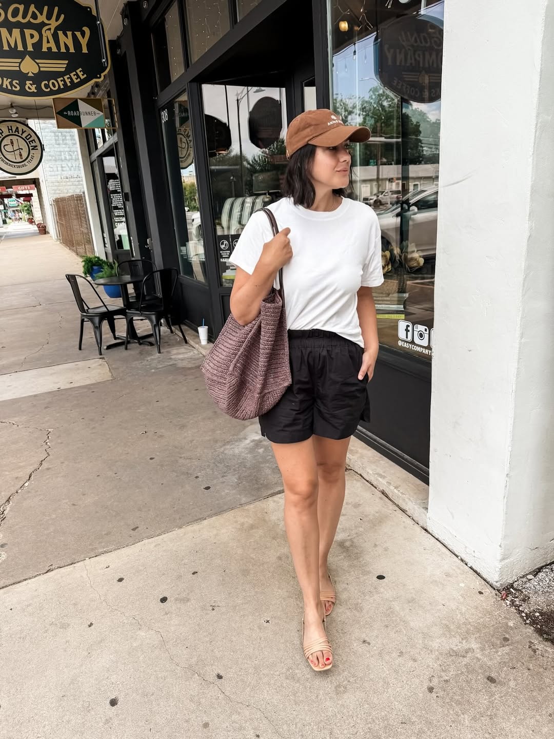 This outfit transforms a comfortable favorite into a stylish ensemble. A simple white t-shirt tucked into black shorts, paired with neutral slides and a casual cap, creates an easy, breathable, and perfectly weekend-ready look.