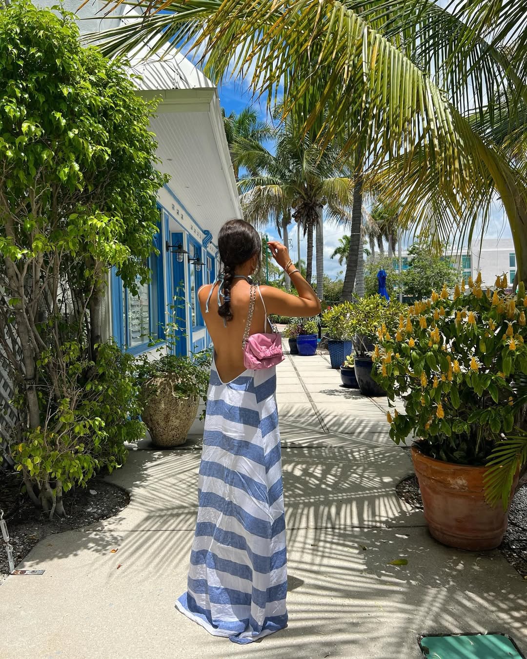 A blue-and-white striped maxi dress with an open back and a small pink bag offers a timeless nautical appeal, enhanced by the backdrop of palm shadows and bright coastal light.