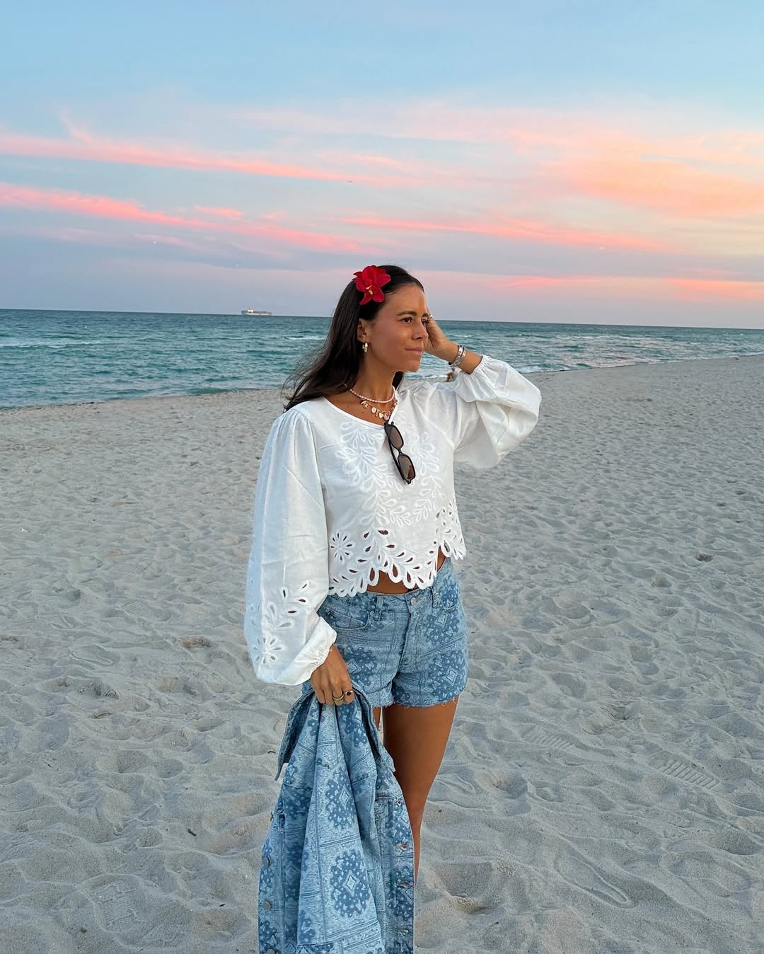 This outfit captures the essence of golden-hour magic. An embroidered white blouse paired with soft denim shorts creates a light, airy, and romantic feel. The addition of a red flower in the hair transforms the look into a scene from an indie film, perfect for a beach setting.