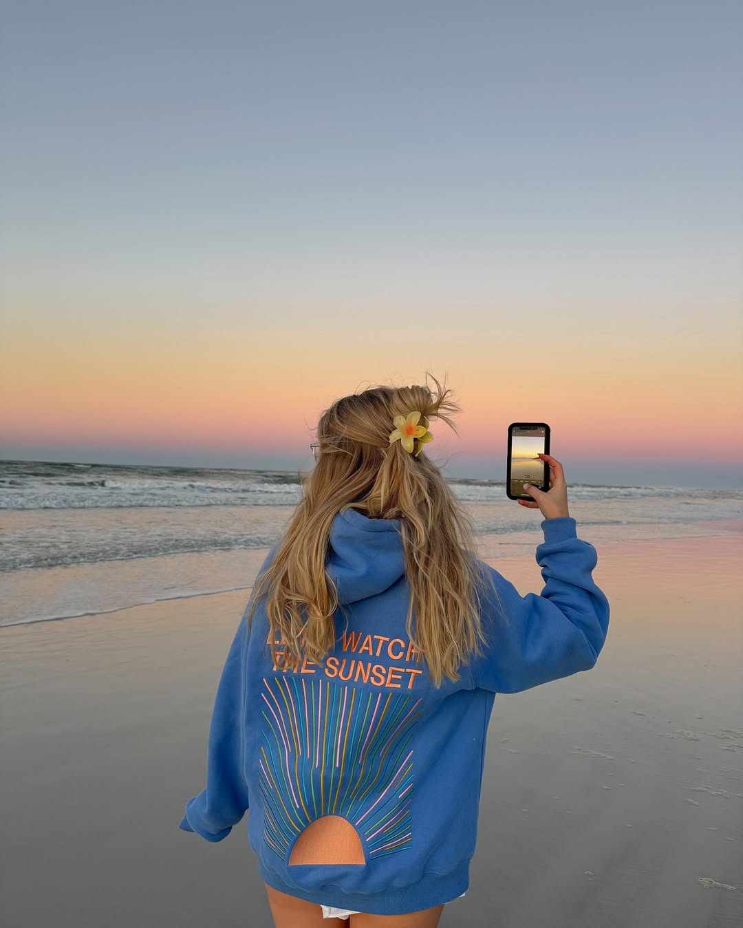 Imagine a beach at golden hour, adorned in a hoodie that encourages watching the sunset, with hair gently caught by the breeze and a single flower tucked behind your ear. This scene feels like a living postcard. The oversized blue sweatshirt provides a cozy contrast against the pastel sky, appearing both playful and comfortable.