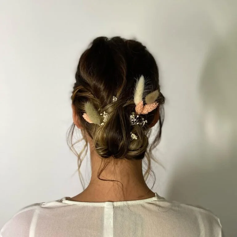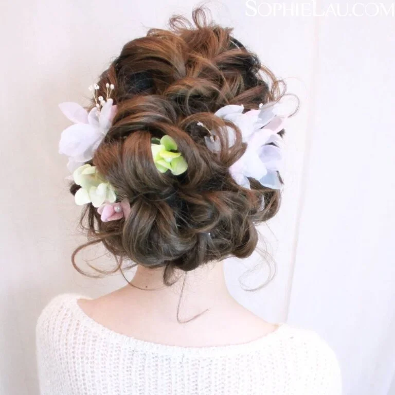This updo feels wonderfully romantic without being overly delicate. Its relaxed structure maintains a casual feel, while the blend of soft pastel florals imparts a fresh, almost artistic quality. It’s a hairstyle that reveals more beauty upon closer inspection, free from any stiffness or overstyling.