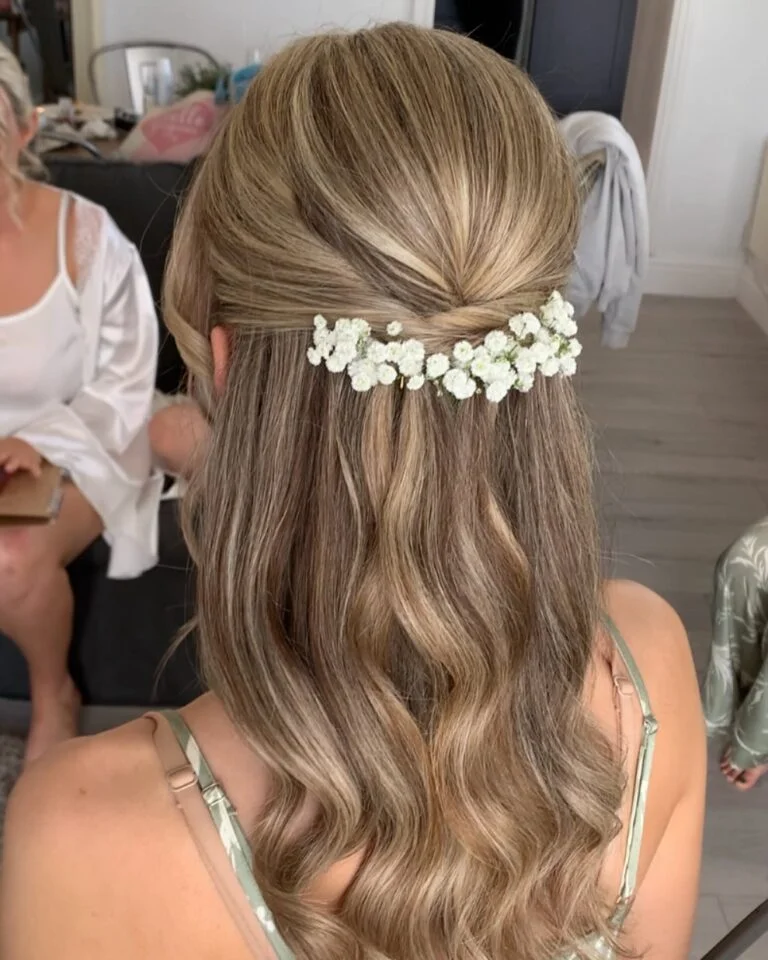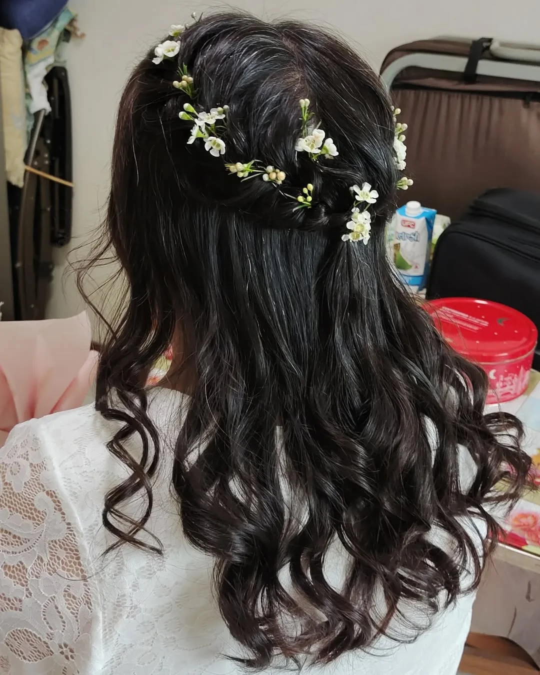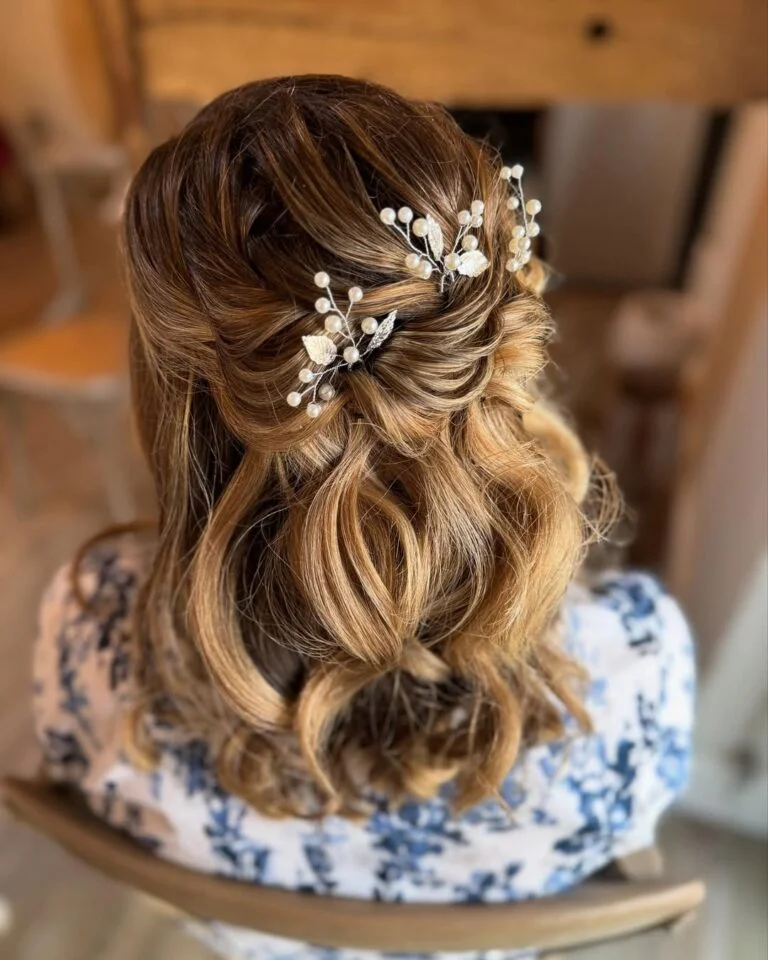 This half-up style possesses an effortless beauty. The waves fall naturally, while subtle floral touches draw the eye precisely where intended. It’s simple yet sophisticated, polished yet relaxed.