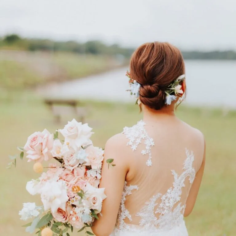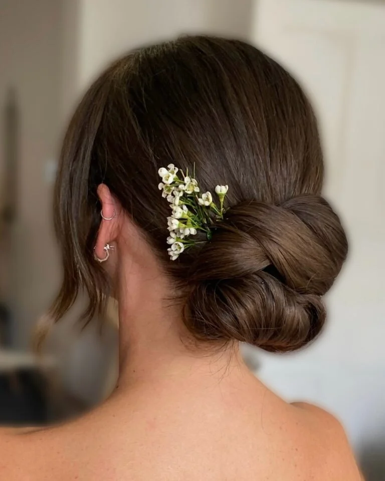 This style emphasizes understated elegance. The low, sculpted knot offers a polished finish without appearing stiff, and the small white blossoms tucked to the side provide just the right amount of detail without stealing focus. It’s a hairstyle that looks effortlessly beautiful in pictures and holds its form throughout the day.