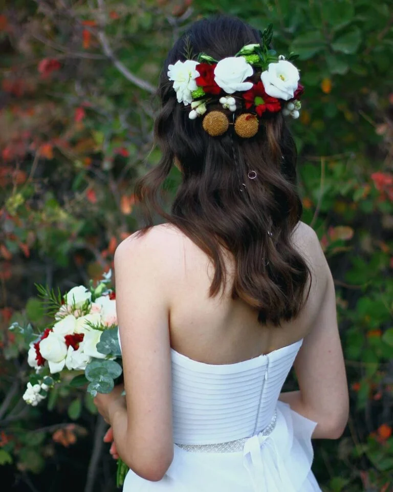 It serves as a lovely reminder that bridal styles don’t always need to be neutral. Bold flowers can harmoniously be part of a celebratory hairstyle.