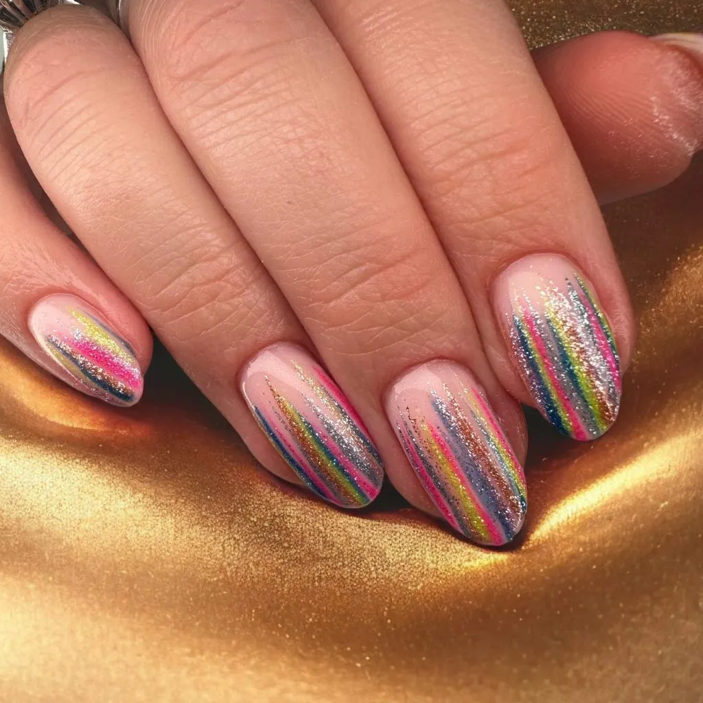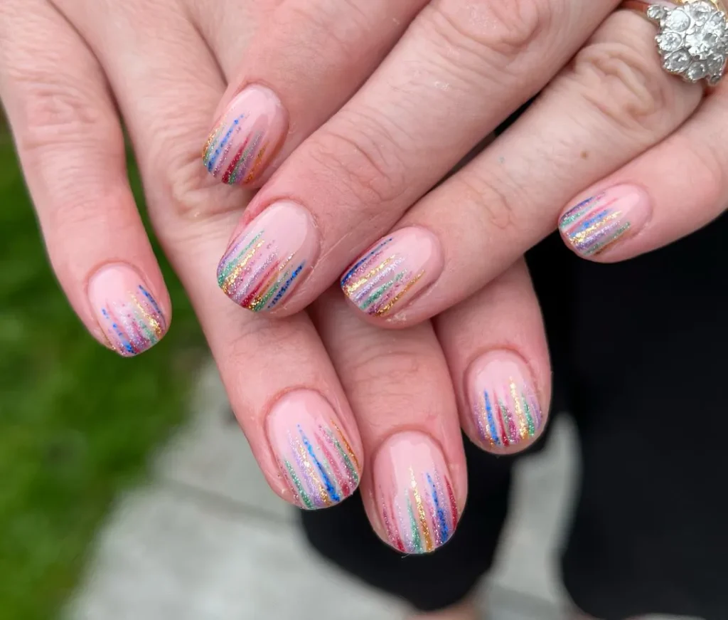 This manicure offers a delightful and charming aesthetic. The sheer pink base adorned with rainbow streaks gives the impression of fireworks viewed through a soft, dreamy lens—light, joyful, and surprisingly versatile.