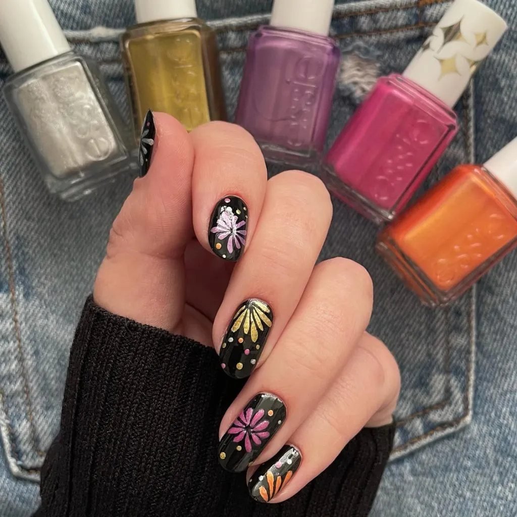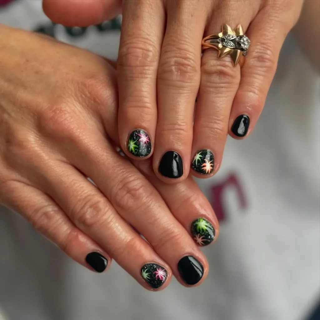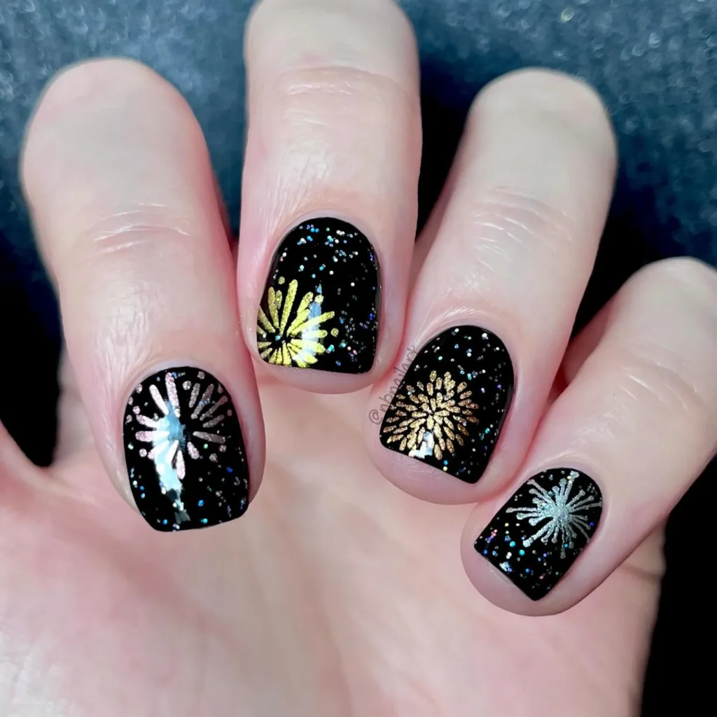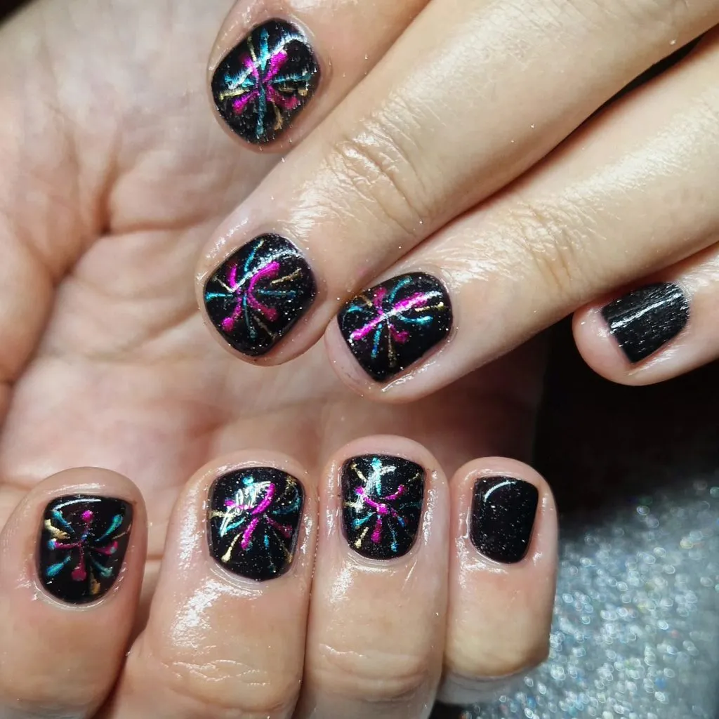 This manicure demonstrates that impactful designs are achievable on shorter nail lengths. The firework accents stand out beautifully against the dark background, ensuring each nail feels deliberately designed.