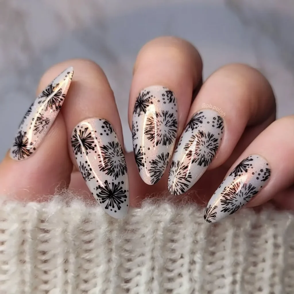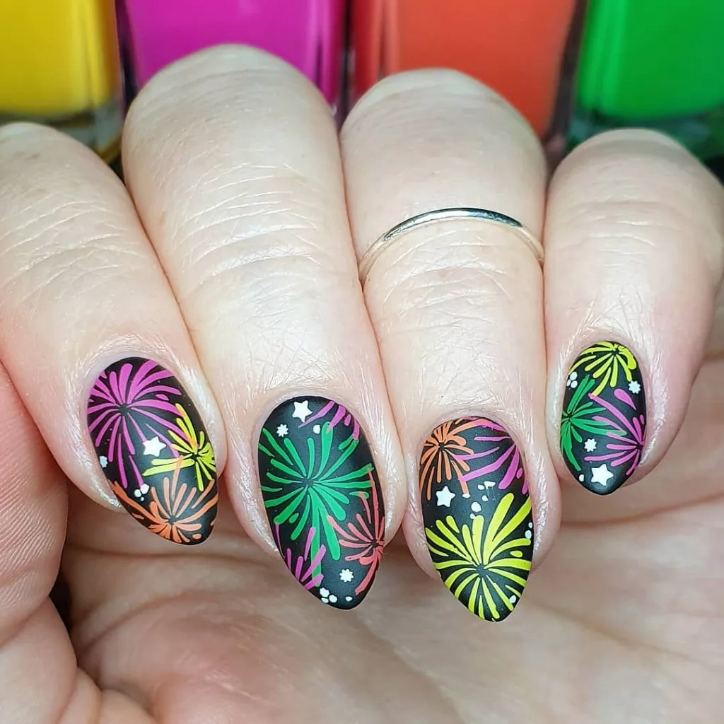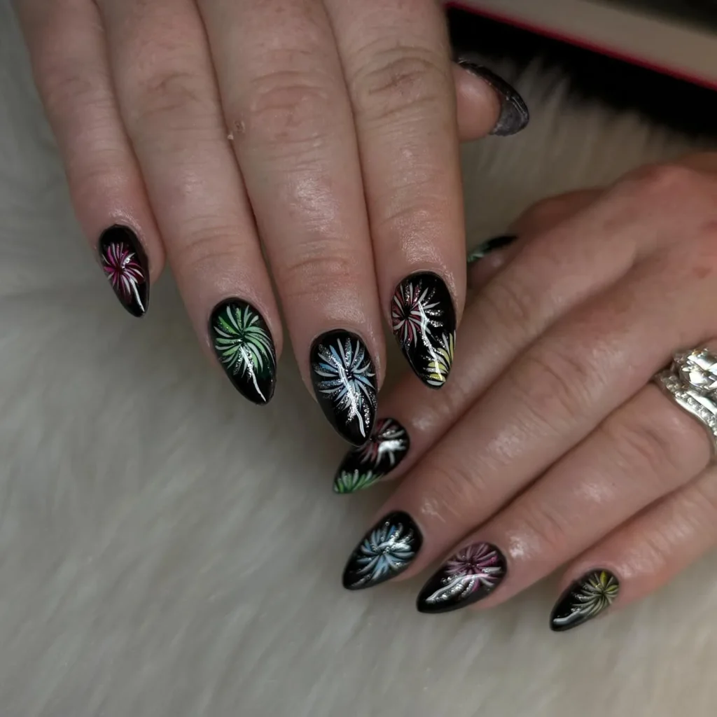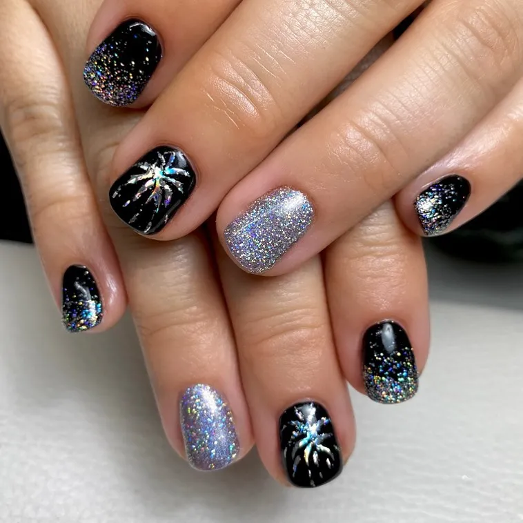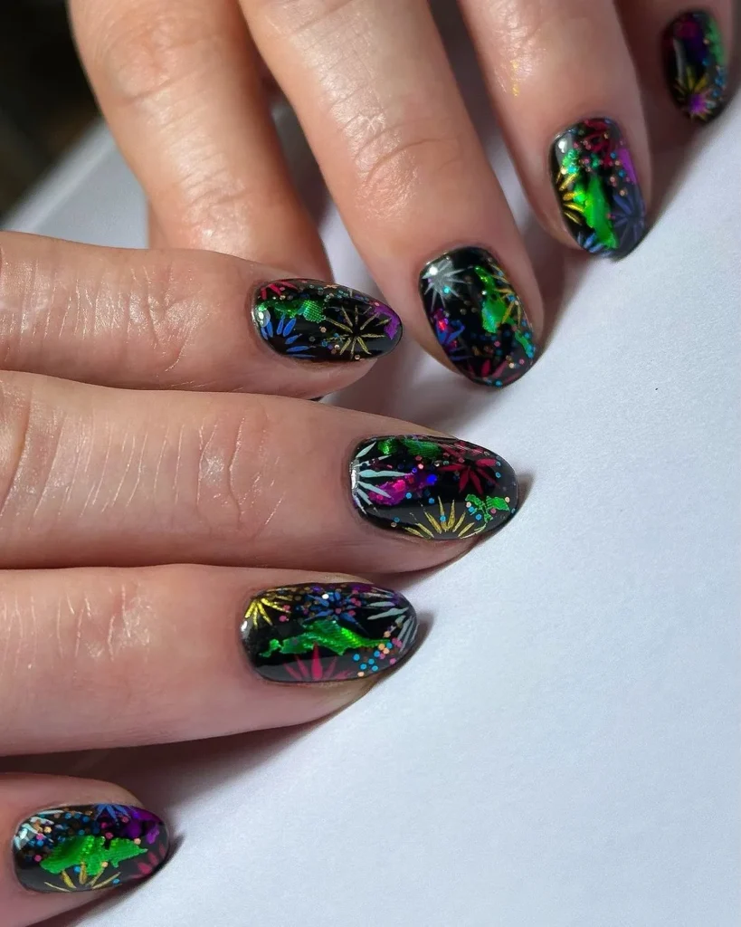 This manicure demonstrates that impactful designs are achievable on shorter nail lengths. The firework accents stand out beautifully against the dark background, ensuring each nail feels deliberately designed.