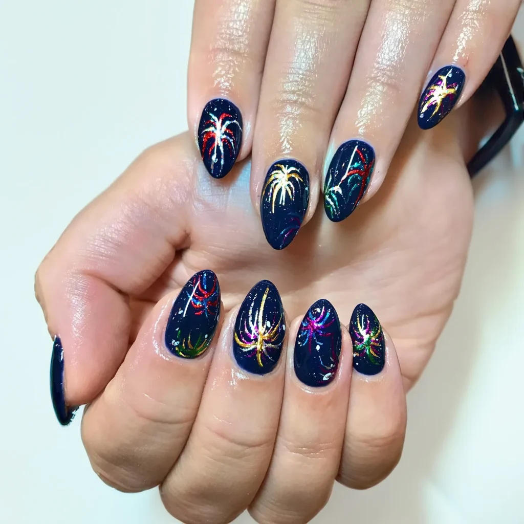 Deep blue hues paired with multicolor bursts create a timeless combination. These nails evoke the classic image of fireworks reflecting in the night sky, capturing that perfect moment just before the sound echoes.
