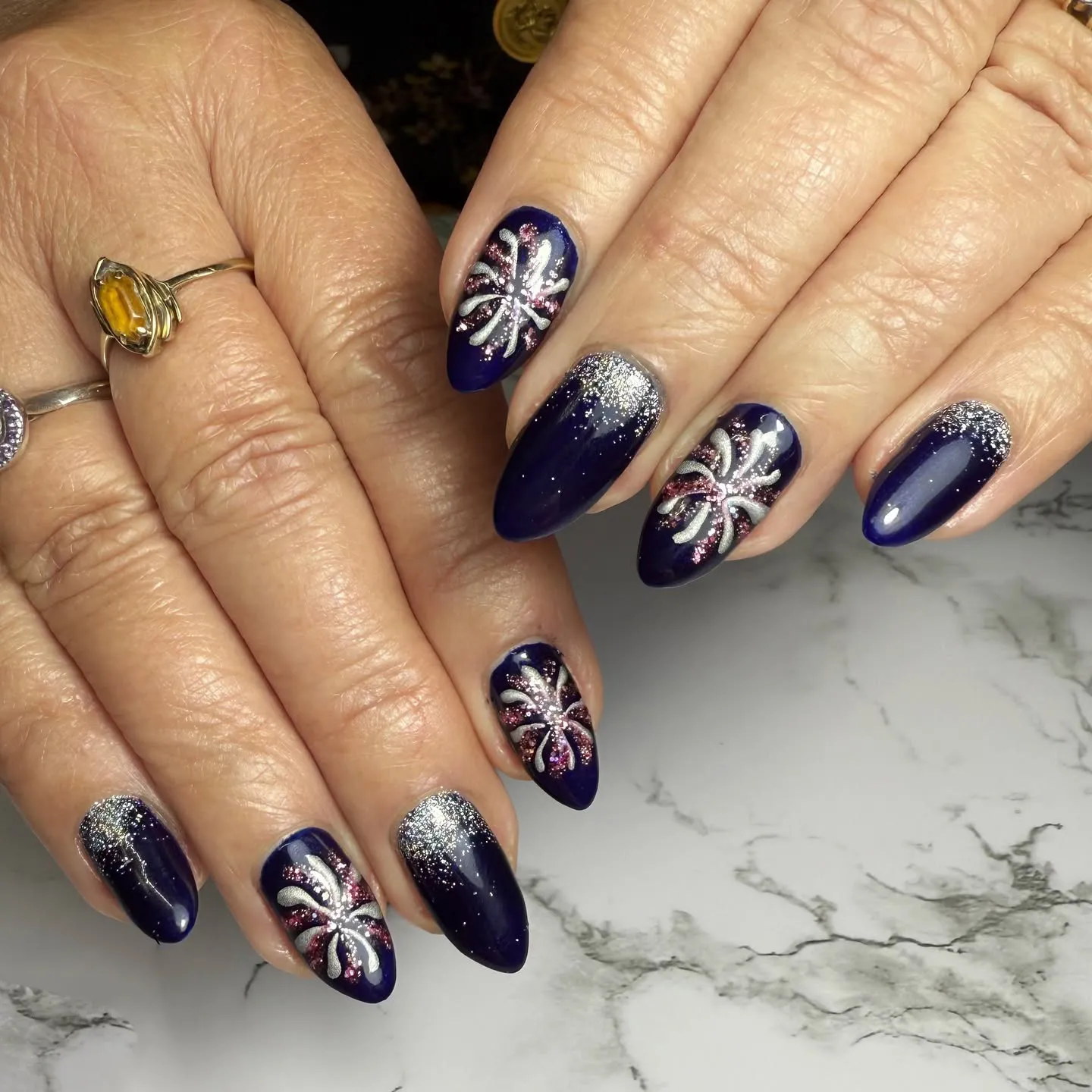 These nails capture the breathtaking moment of fireworks frozen at their peak explosion. The deep navy background makes the silver and pink bursts appear exceptionally dramatic, resembling the spectacle of the night sky coming alive.
