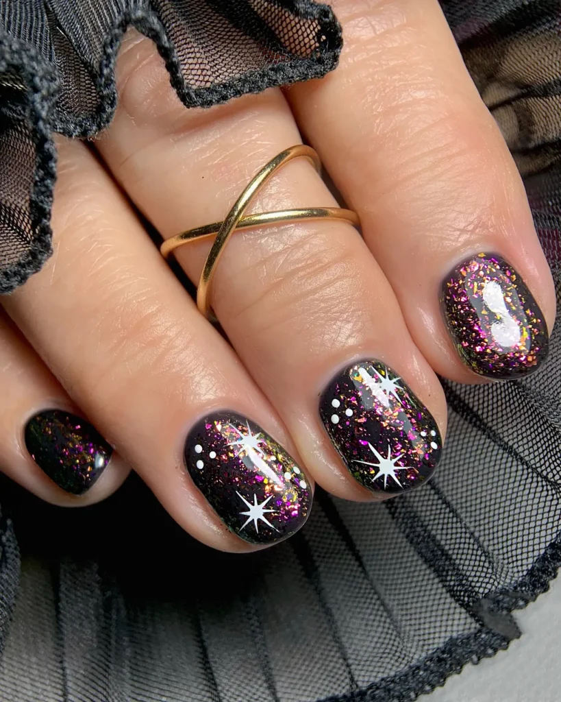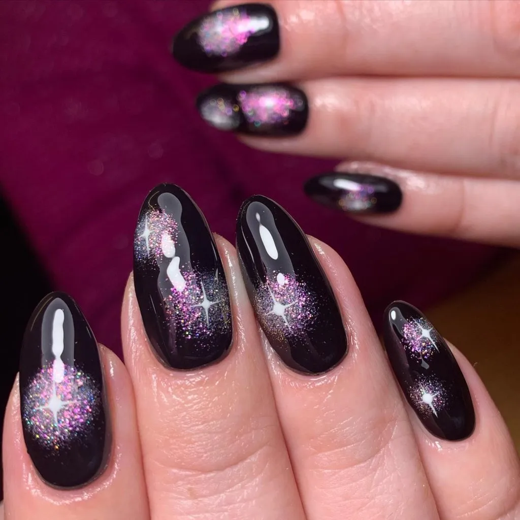 These nails resemble fireworks drifting through space, with dark, glossy finishes and concentrated sparkles that seem to emit their own light. The shimmer effect feels almost three-dimensional.