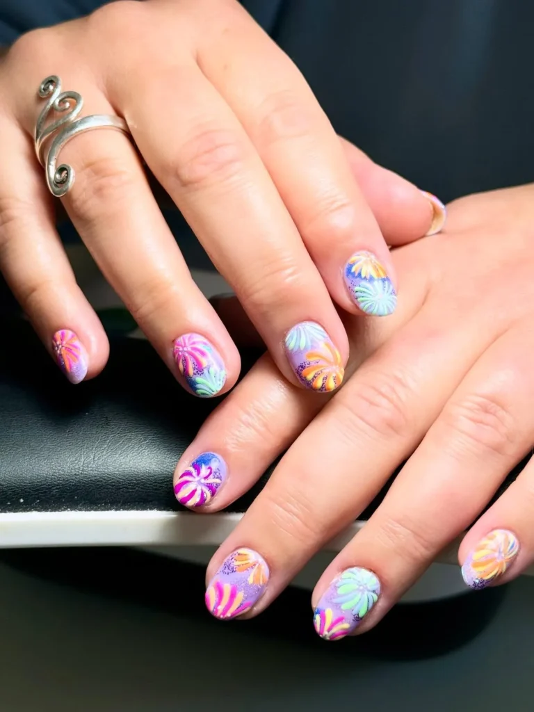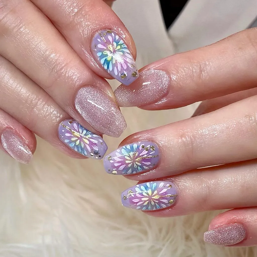 This manicure artfully blends soft pastel shades with floral firework elements, resulting in a beautifully dreamy effect. The gentle colors make the design feel light and ethereal, akin to fireworks viewed through a soft-focus lens.