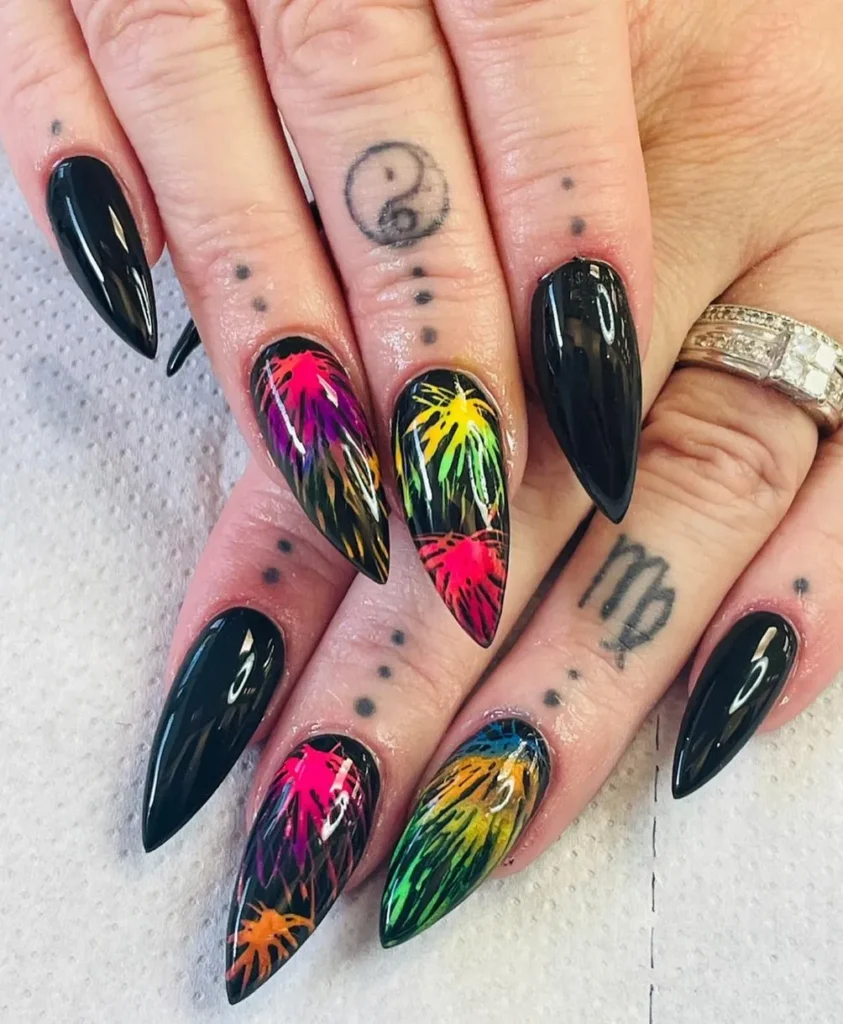 This manicure goes all out with vibrant color, which is truly admirable. Bright rainbow fireworks set against a black base make the colors intensely pop, radiating full celebration energy. There’s a sense of movement, strong contrast, and complete confidence in this design.