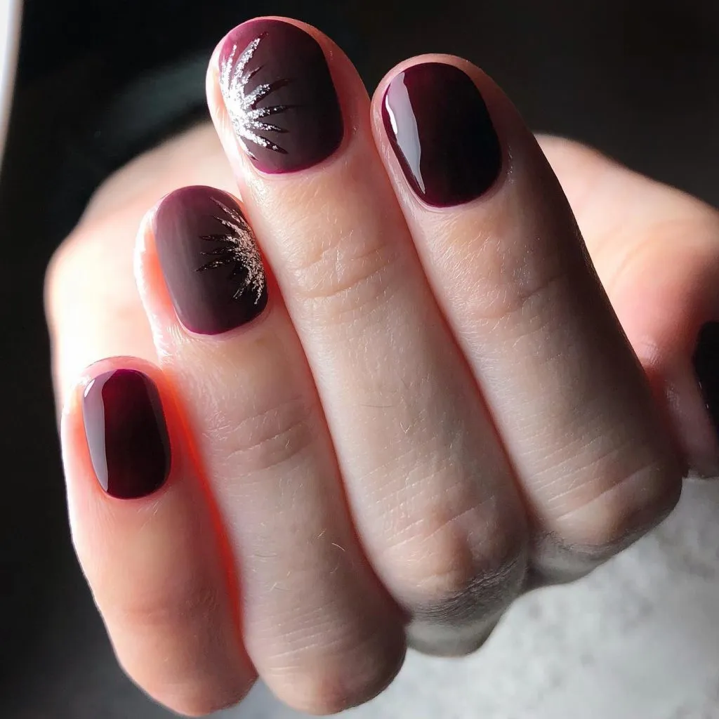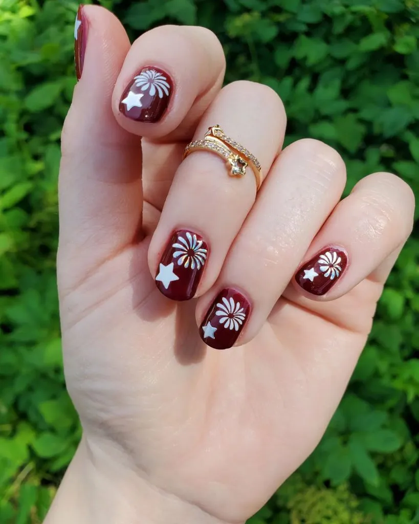 This firework nail design presents a clean and contemporary aesthetic. The dark polish maintains a sleek appearance, while the small firework accents add a perfect touch of playful flair.