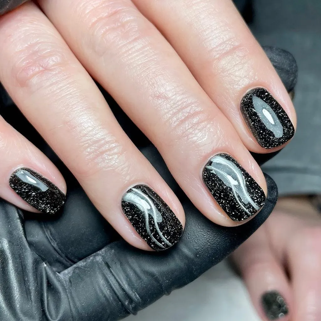 These nails showcase a subtle yet captivating style. Delicate trails of sparkle over a black base resemble the lingering glow of fireworks after they’ve unfurled—soft, radiant, and subtly mysterious. It’s a design that offers quiet drama, drawing attention through its understated allure.
