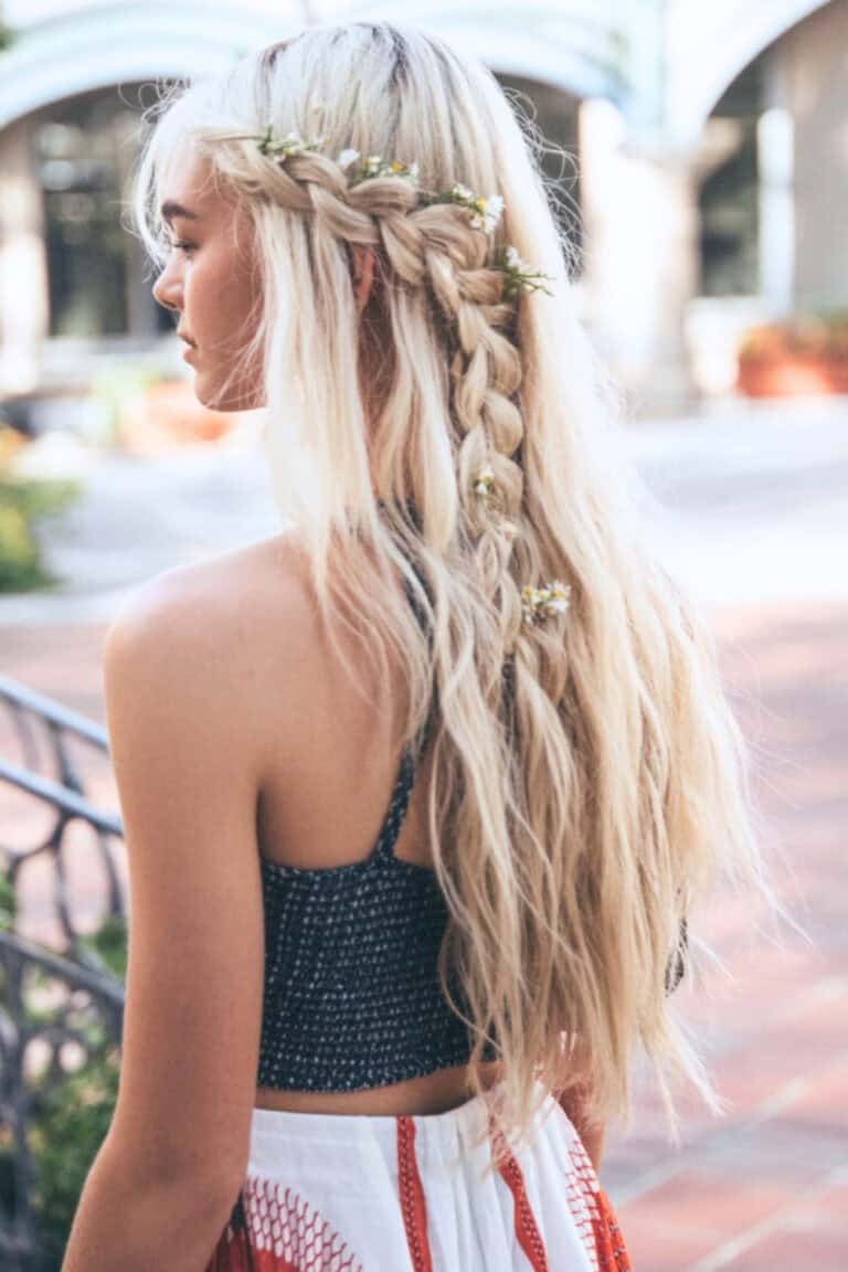 A side braid enhanced with a tucked flower offers a romantic, cottagecore-meets-coastal aesthetic. This soft and whimsical style creates a look as if you’ve stepped out of a fairytale beach picnic.