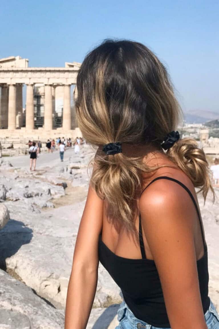 These low, messy pigtail buns project a carefree, “woke up like this” tourist vibe. The addition of scrunchies offers a retro touch while keeping the style functional and relaxed for warm vacation days, perfect for capturing those travel vlog moments.