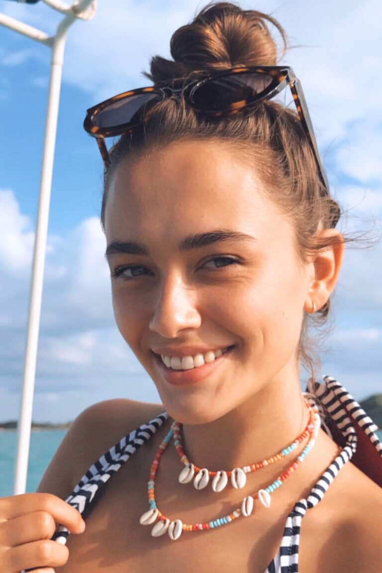 The effortlessly chic messy top knot embodies a “that girl” energy, keeping you cool and stylish on a boat trip. Paired with shell necklaces and sunglasses perched on top, it instantly activates a beachy baddie persona.