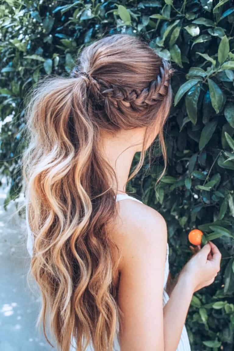 A wavy ponytail crowned with a braid offers delightful boho beach babe vibes. It’s a charming and flirty style that appears more intricate than it is, perfect for relaxed summer moments and embodying a soft summer aesthetic.