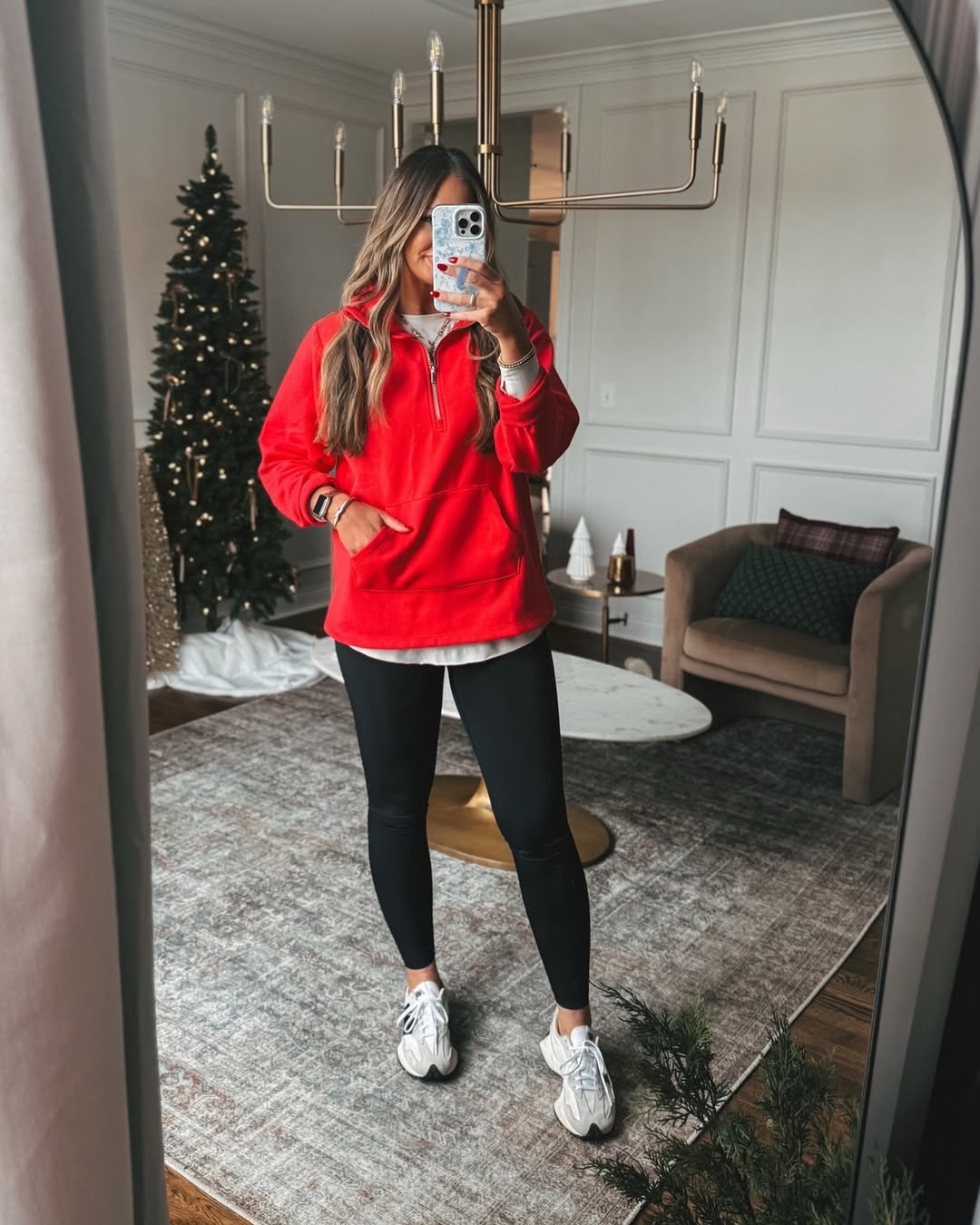 This red hoodie layered with leggings embodies the ultimate comfortable attire. It feels soft, familiar, and styled with just enough intention to appear deliberate. This ensemble is perfect for days spent at home, quick errands, or any moment when comfort is paramount, but style remains important.