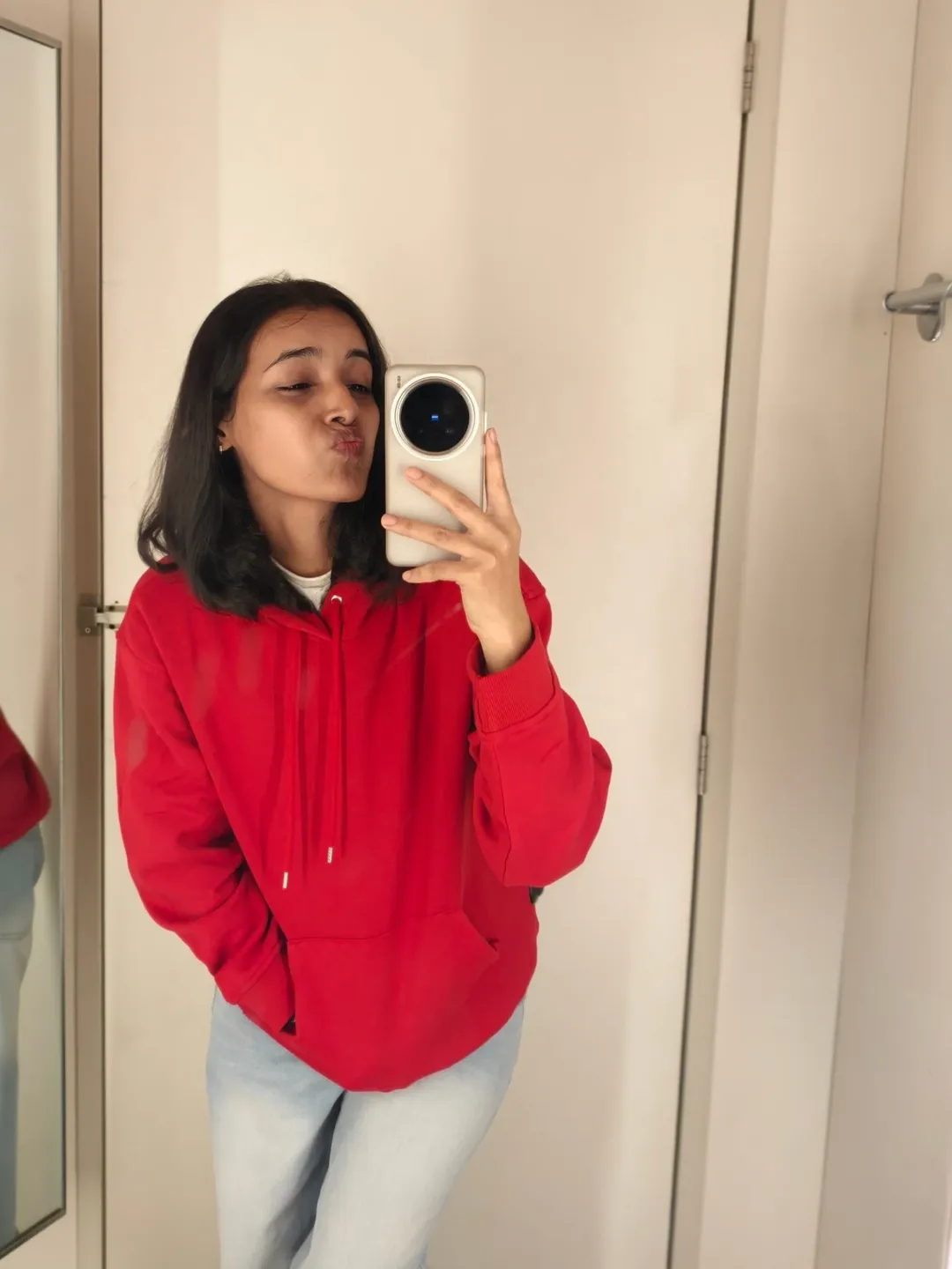 This ensemble feels authentically relatable. Pairing a classic red hoodie with light denim creates an easy, wearable outfit suitable for nearly any occasion. It represents that go-to piece that always looks good without demanding excessive effort.