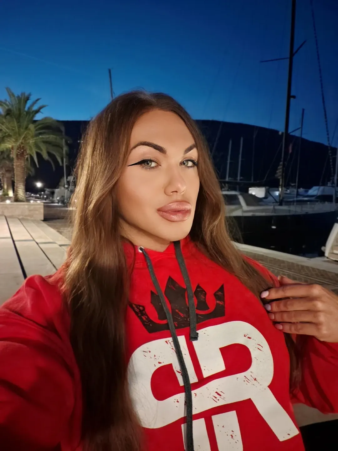 This look definitively proves that hoodies can be incorporated into evening wear. The bold red color, striking graphic elements, and glamorous makeup create an elevated and confident aesthetic. It presents casual streetwear with an after-dark energy, offering an unexpectedly chic result.