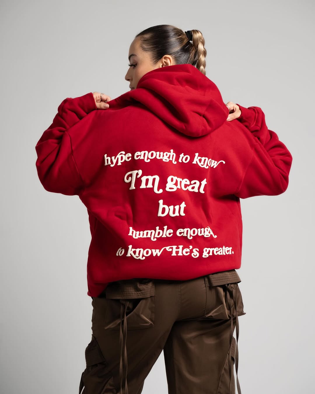 This look is a testament to confidence, with the red hoodie serving as a bold statement piece. The prominent text on the back adds a deliberate and powerful touch, transforming it into casual streetwear with a clear message—strong, contemporary, and eye-catching.