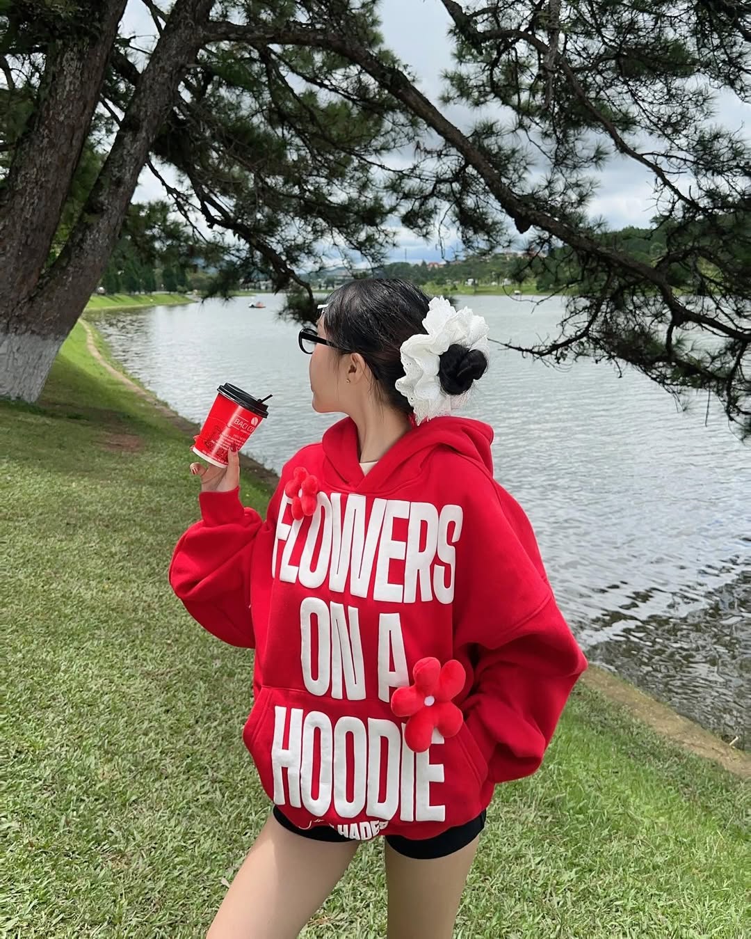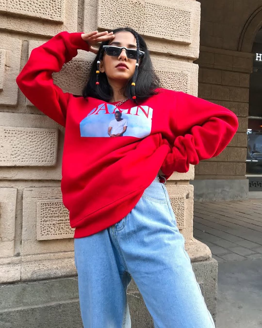 This ensemble concludes with a powerful street style statement. The oversized red hoodie featuring a graphic front exudes confidence, attitude, and edge all in one piece. It’s the kind of look that naturally stands out—cool, expressive, and unapologetically casual.