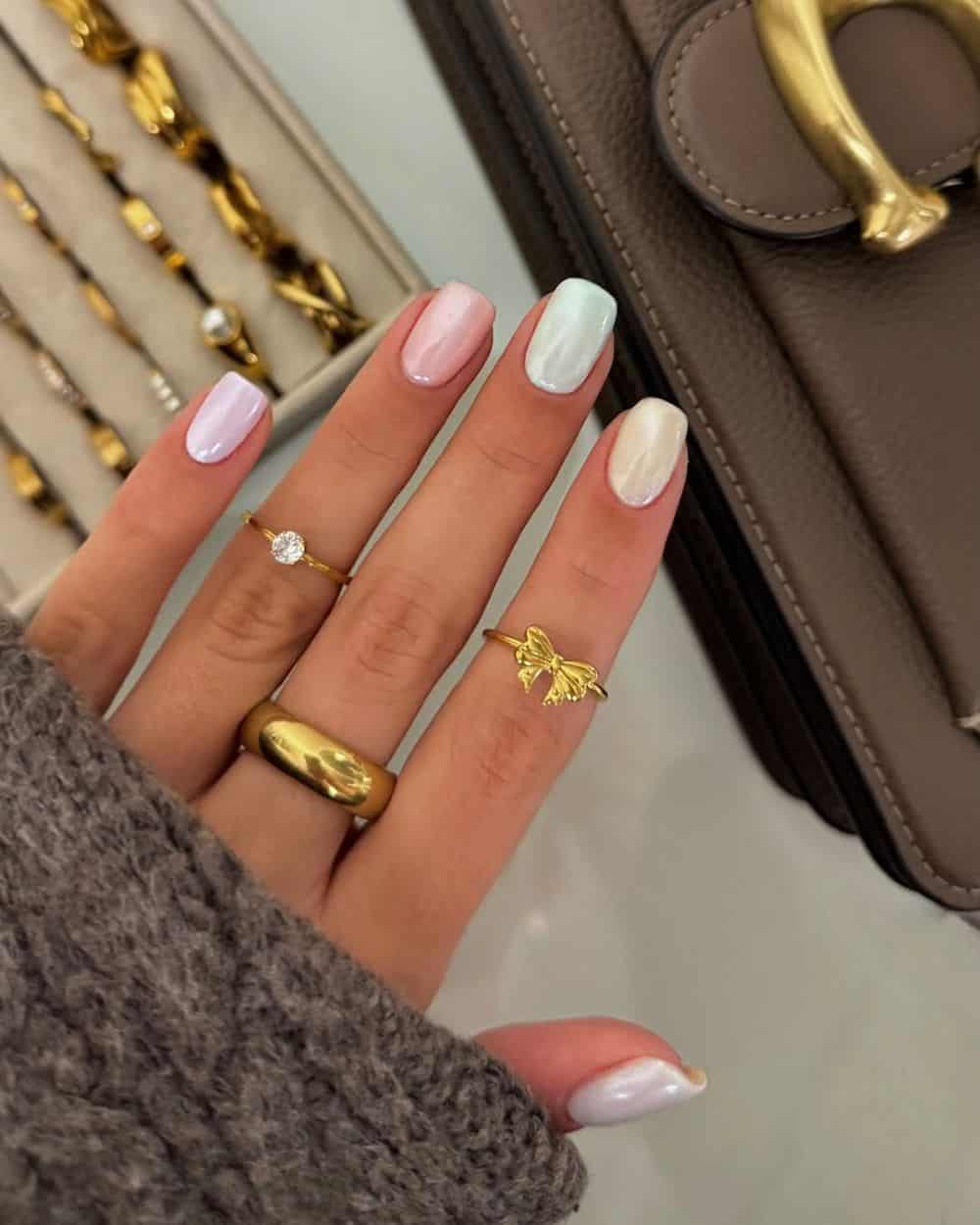 This trend merges soft, dreamy pastels with a glossy chrome finish, creating a look that’s both ethereal and modern. The pastel gradient evokes a classic spring feel, while the chrome powder adds a contemporary edge. These nails are ideal for April events like garden parties, baby showers, or birthday celebrations.