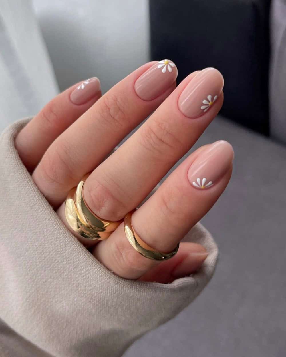 A subtle yet playful design features delicate daisy accents on a simple, nude base. The neutral canvas provides an elegant foundation for everyday wear, while the tiny ivory flowers add a touch of whimsical charm, making it a perfect choice for an understated spring manicure.