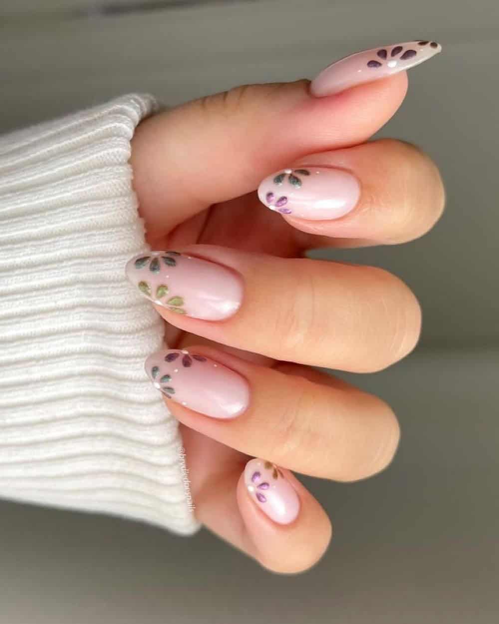 For a floral design that remains refined and sophisticated, opt for short, clean nails adorned with muted pink flowers. This delicate and chic style is perfect for spring and suitable for professional environments. If desired, you can substitute the muted pink with lighter pastel shades like lavender or blue.