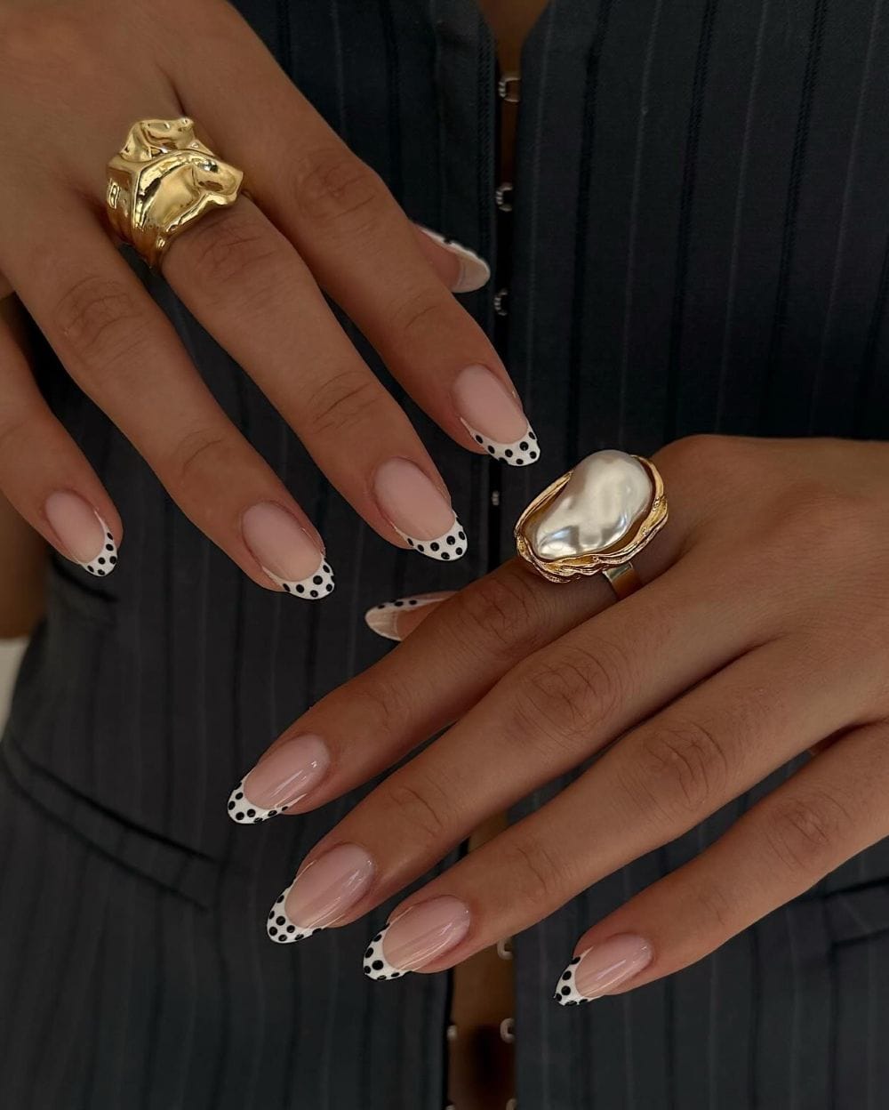 Infuse a classic French manicure with playful personality by replacing the standard white tips with a charming polka dot pattern. This modern twist offers an elegant yet fun aesthetic, perfect for achieving a casual-chic vibe during the spring season. It’s an ideal choice for a look that is both stylish and subtly whimsical.