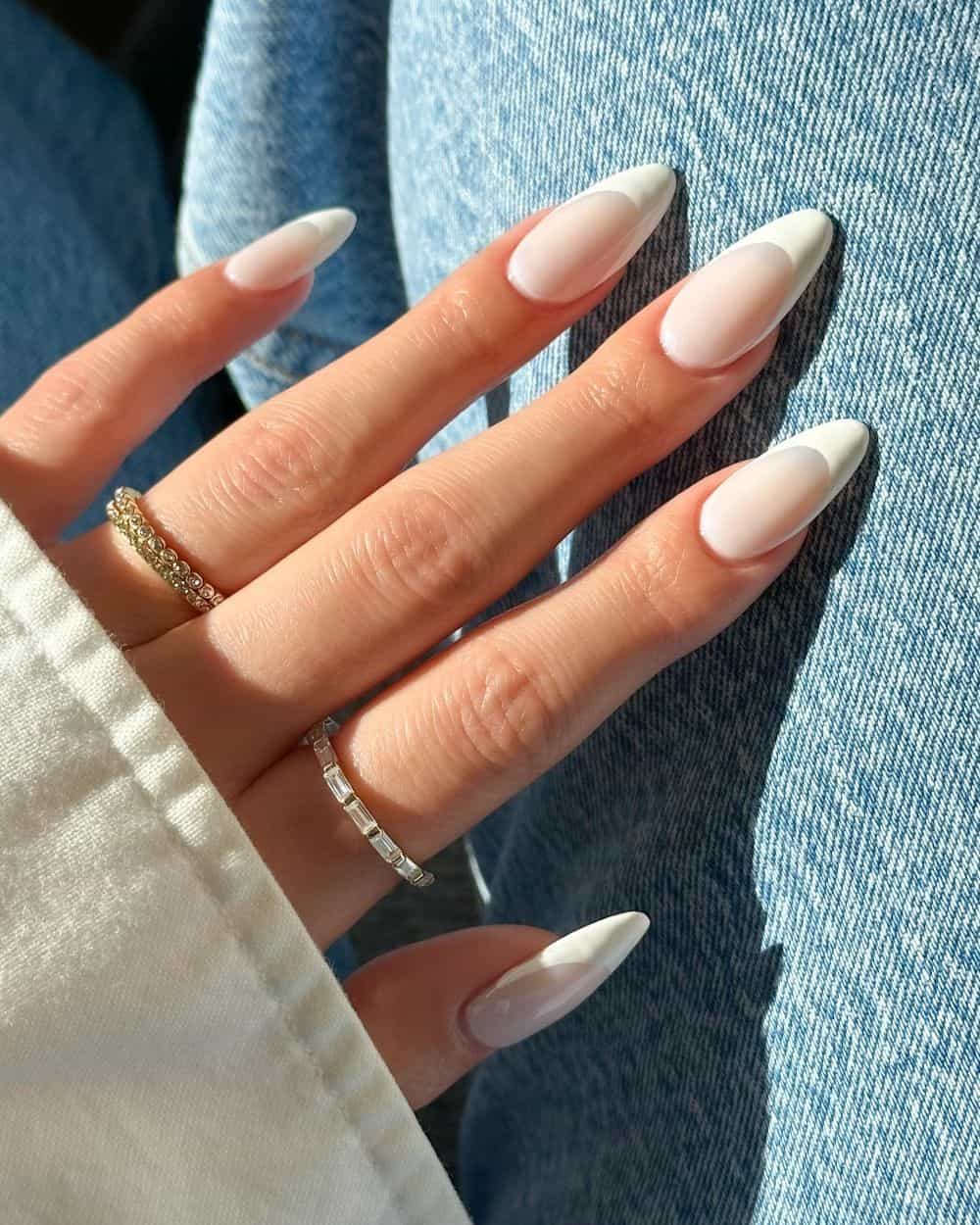 Milky nails, known for their soft, translucent finish, are a prominent trend this spring, offering a fresh and airy aesthetic. Contrasting this sheer base with sharp ivory tips creates a sophisticated blend of contemporary and classic design elements. This manicure offers an elegant appearance that still incorporates a playful touch.