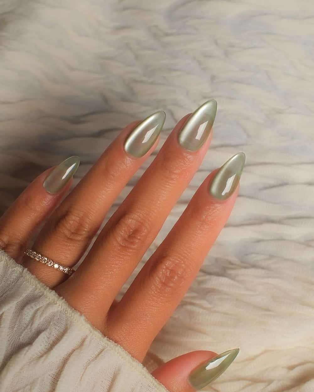 For those seeking a manicure that is both sophisticated and grounded, a sheer sage color with a cat-eye finish is an exquisite option. This elegant design is particularly fitting for the spring season, offering a refined take on natural tones.
