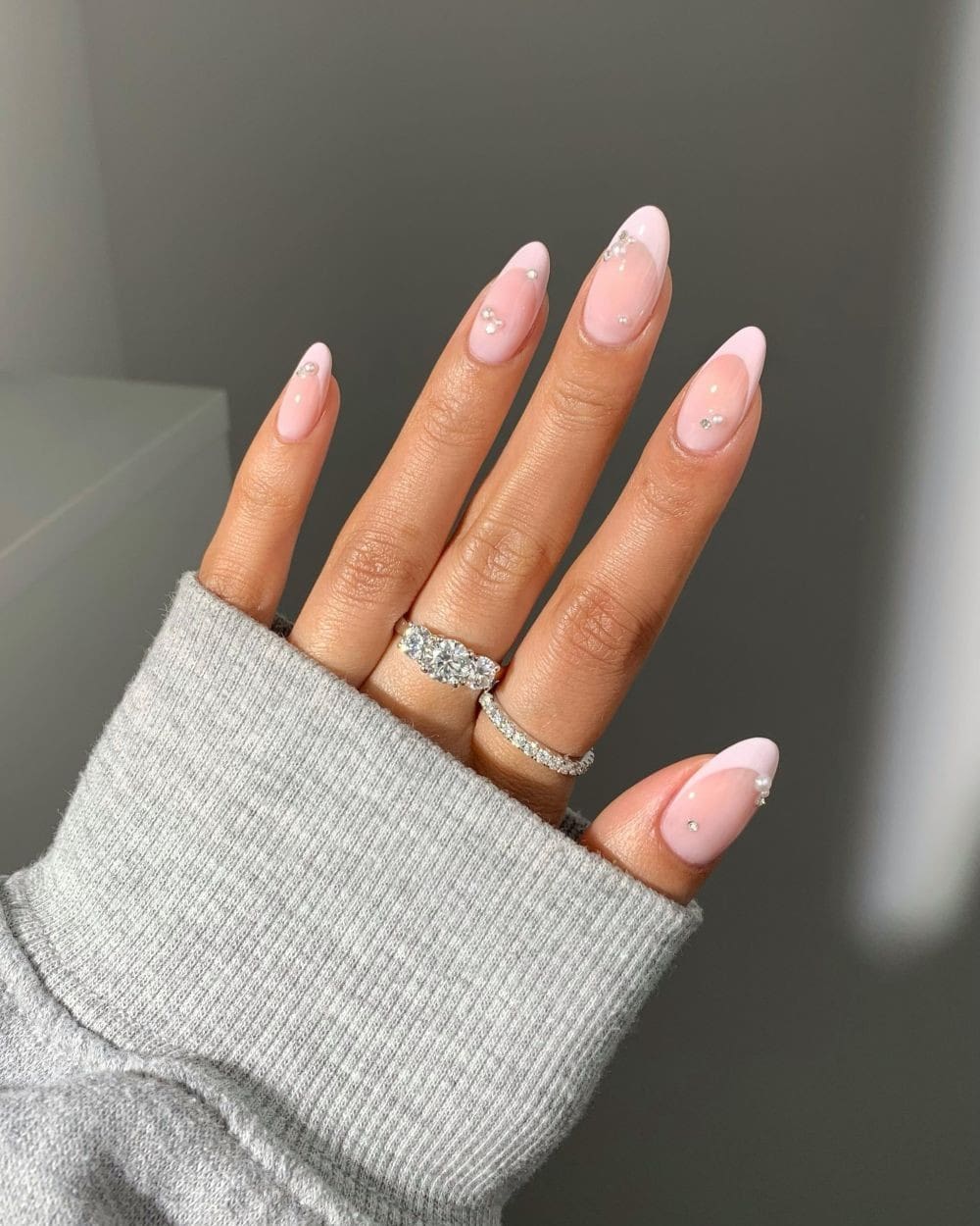 Soft pink tips adorned with delicate jewels provide a fresh and feminine aesthetic with an added touch of glamour. The pale pink polish creates an elegant base for everyday wear, while the sparkling accents make it effortlessly suitable for spring occasions.