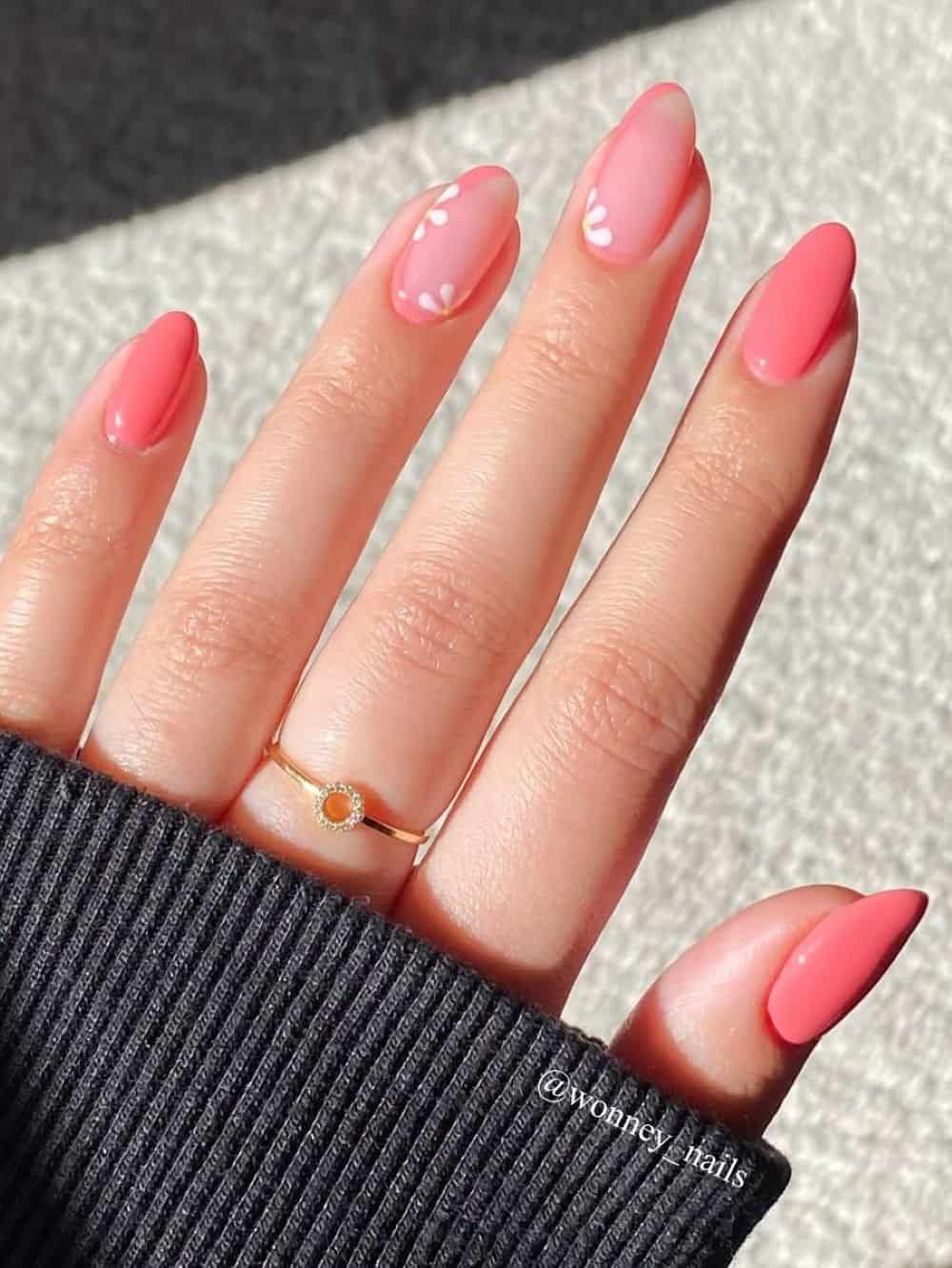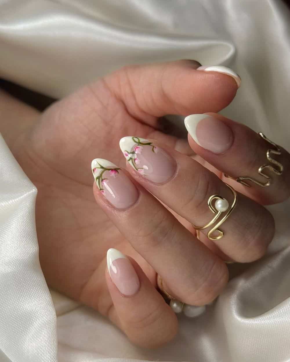 Elevate crisp white almond tips with an elegant floral design for a spring-inspired manicure. You can hand-paint your favorite blossoms or use nail stickers to achieve a charming look. This design feels sophisticated and timeless, making it ideal for occasions like Easter or baby showers in April.