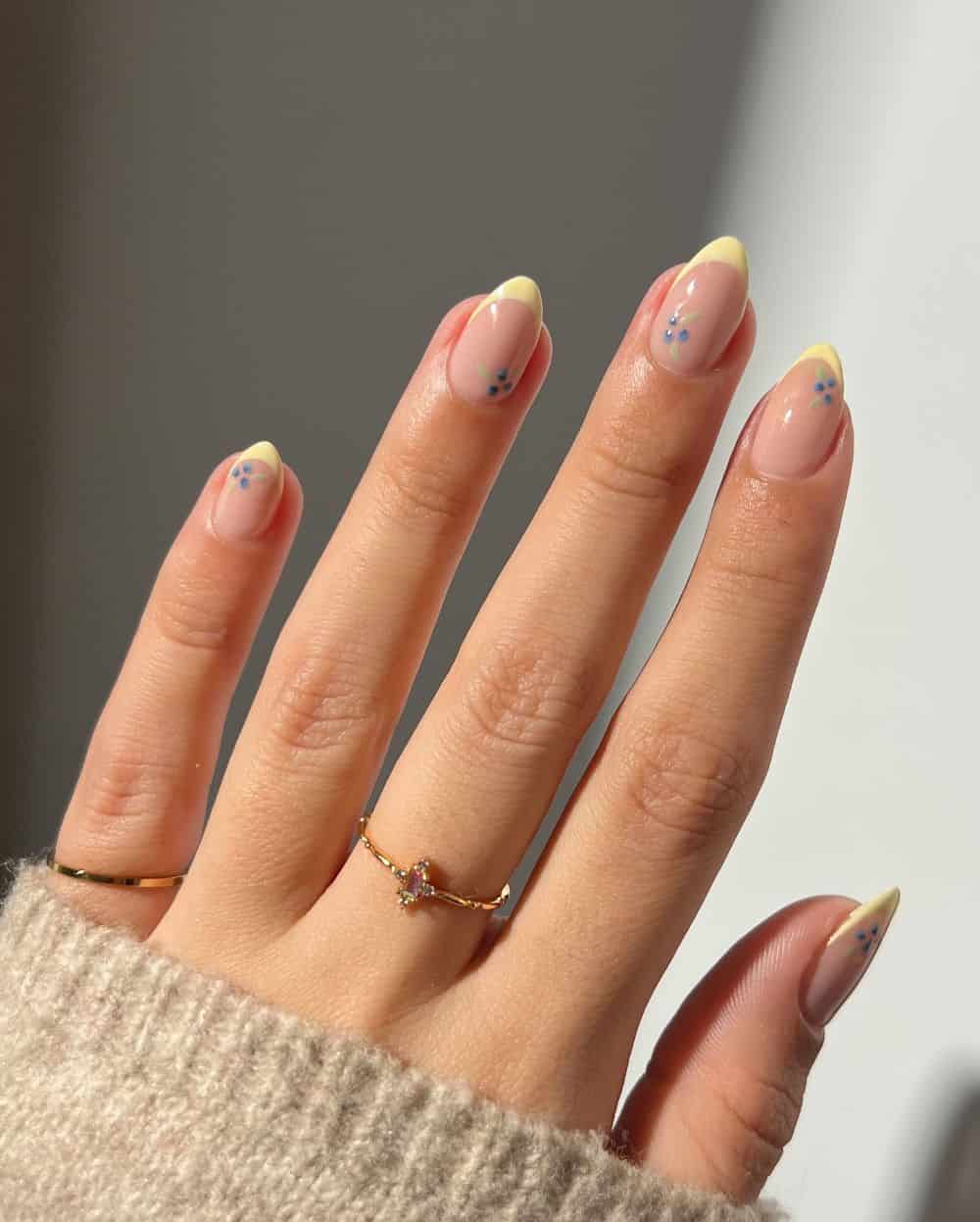 Butter-yellow French tips accented with dainty blueberry art provide a whimsical and unexpected take on a classic nail design. This combination is perfect for spring, offering just the right amount of fun while maintaining a chic and simple appearance.