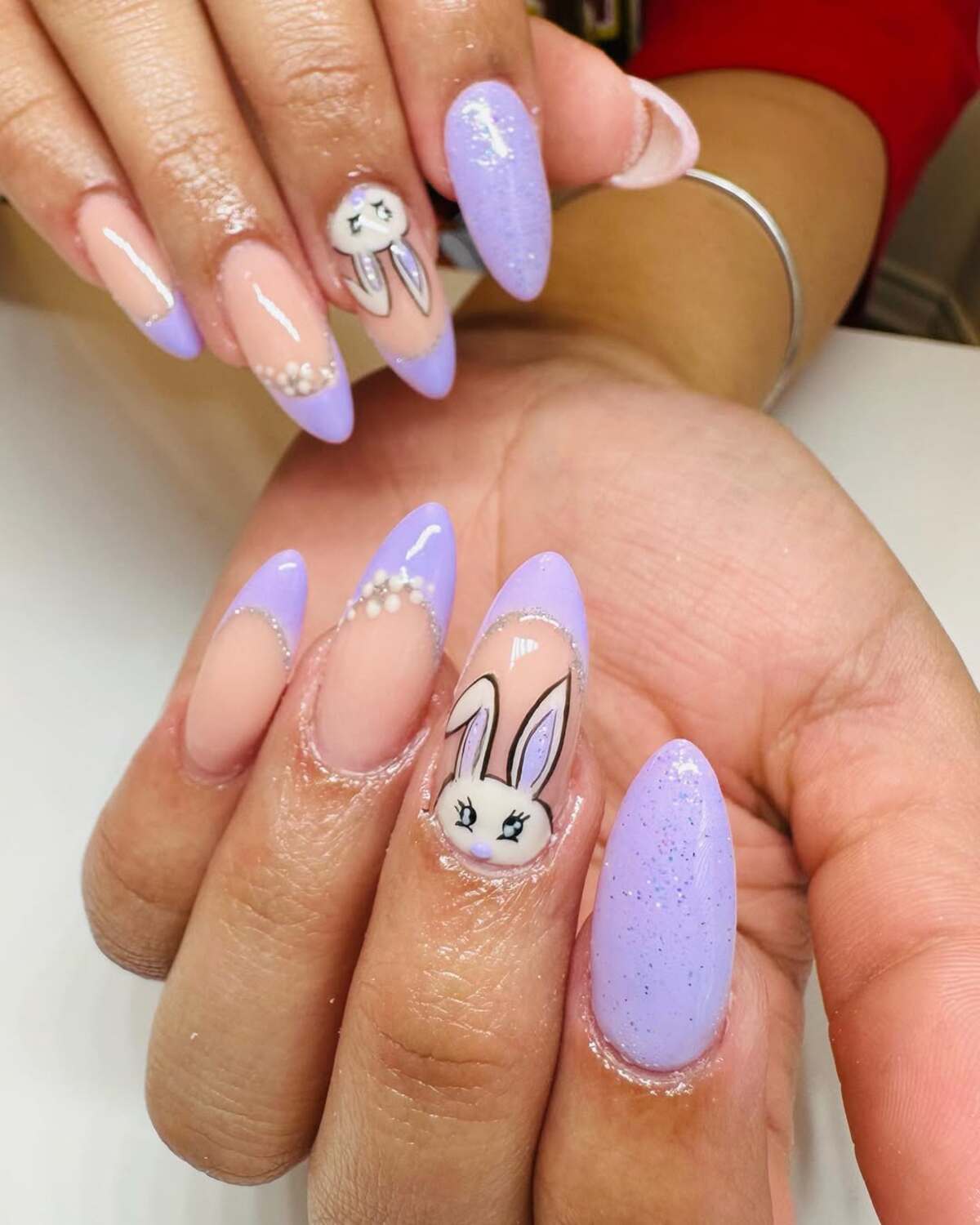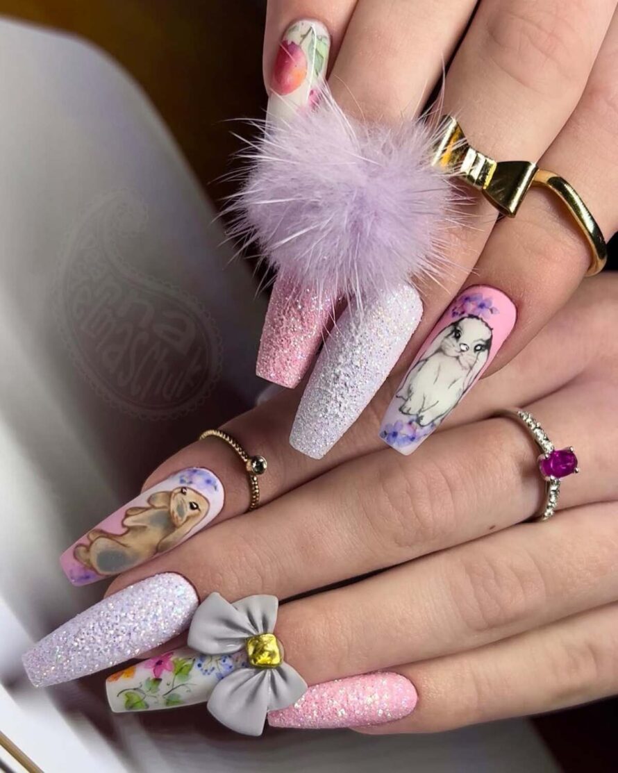 These extended nails embrace a vibrant aesthetic, featuring pastels, detailed bunny illustrations, and a soft glam finish that creates a beautifully amplified look.