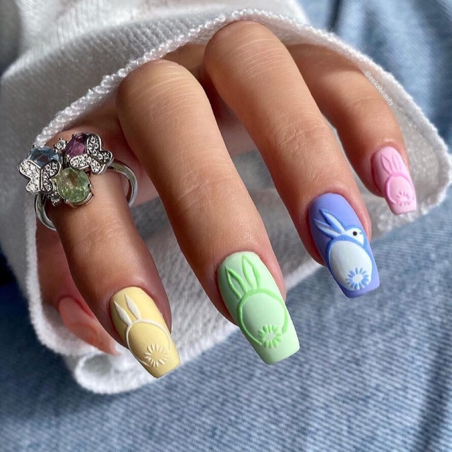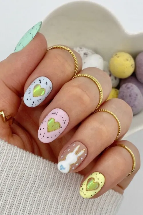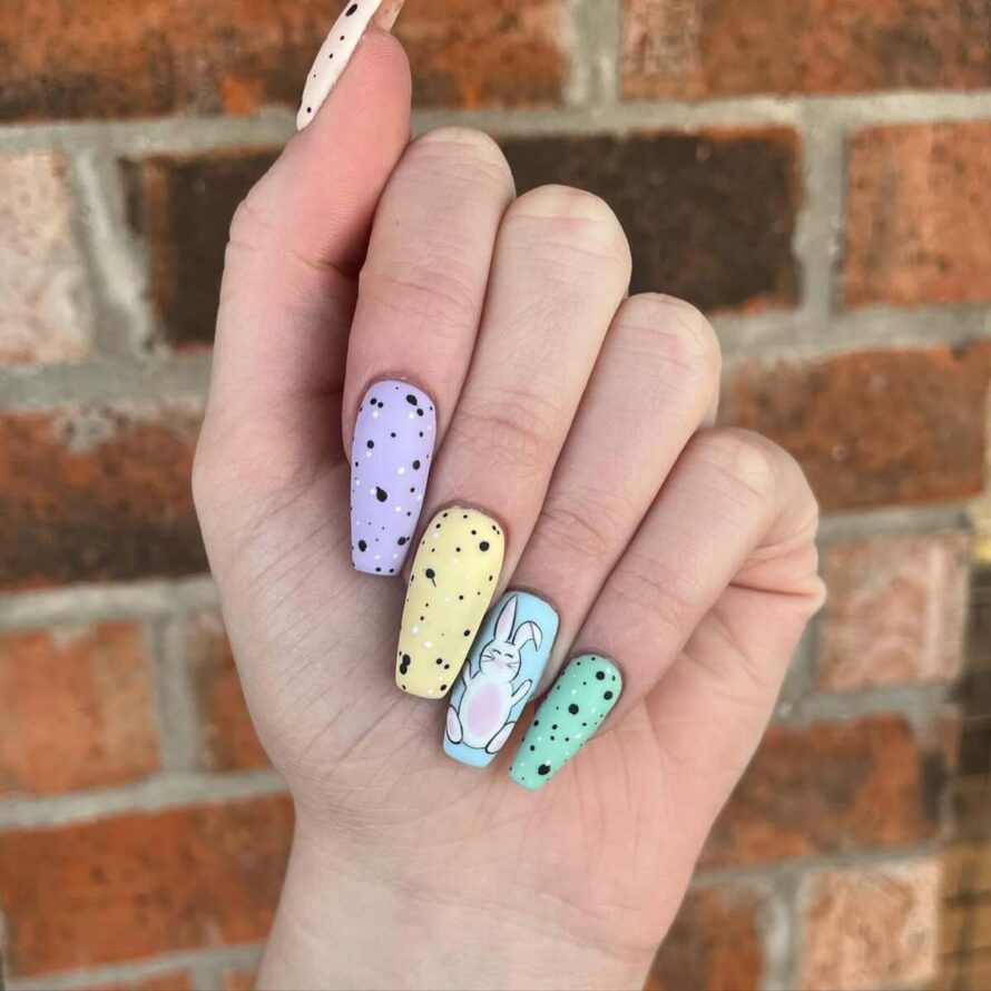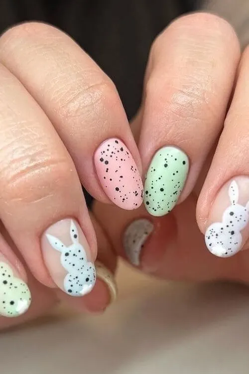 This design makes a vibrant statement while maintaining its charm. The colorful bases paired with speckled textures give a playful nod to painted eggs, while the bunny accent nail stands out as a focal point.