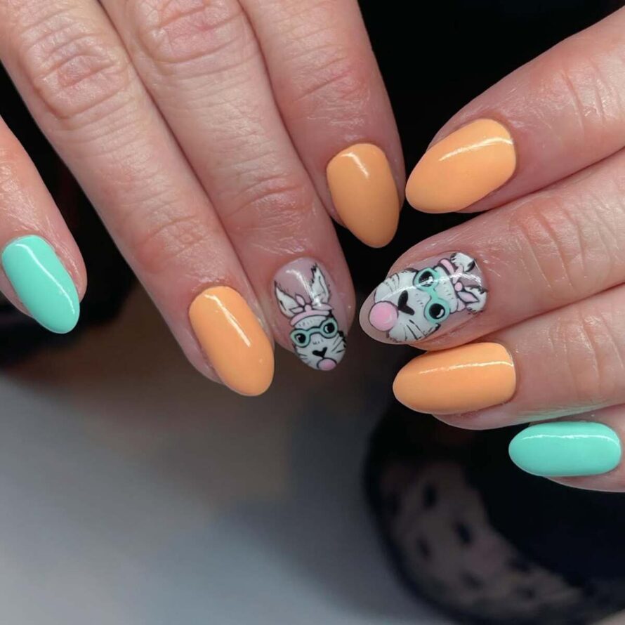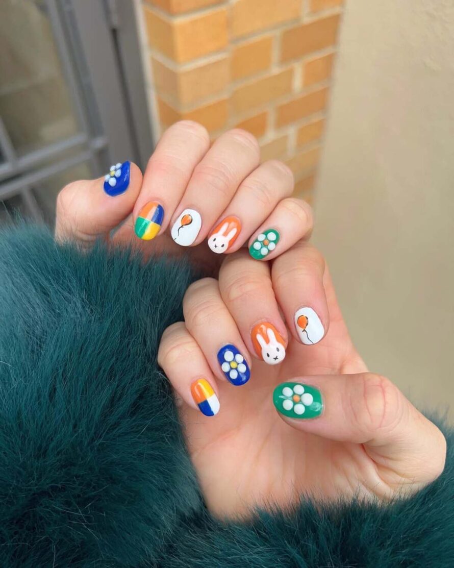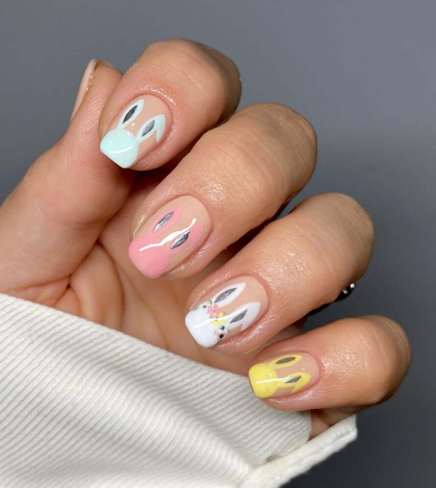 These nails exude sheer fun with their bright pastel colors, animated bunny faces, and bold color blocking, creating a joyful and personality-filled set.